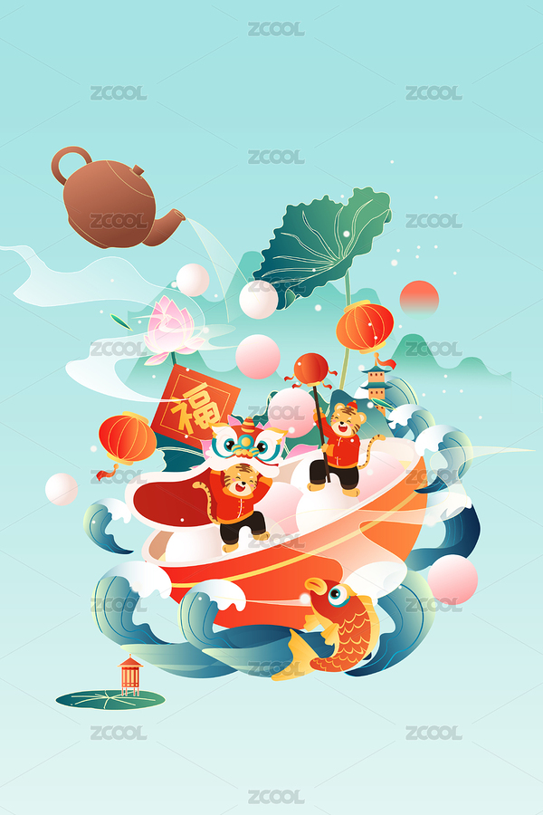 牛年新年国潮插画卡通牛骑锦鲤与狮子贺新年