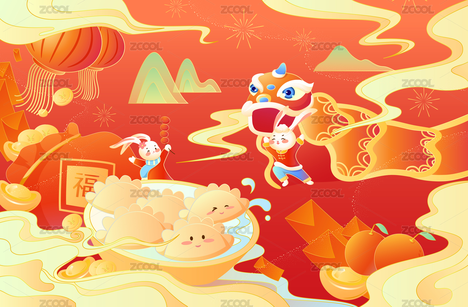 兔年春节吃饺子舞狮插画