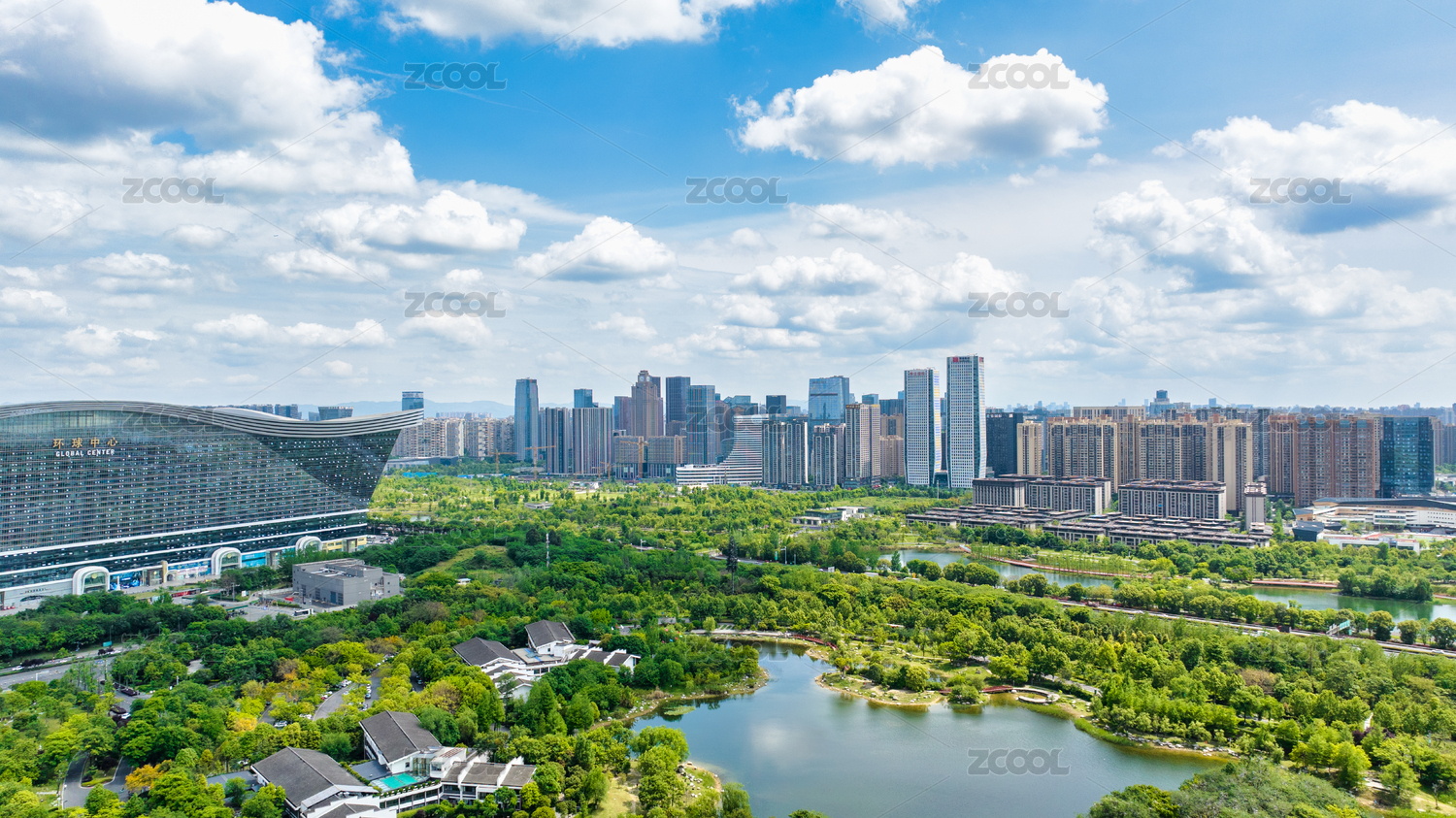 中国四川成都桂溪生态园环球中心航拍图