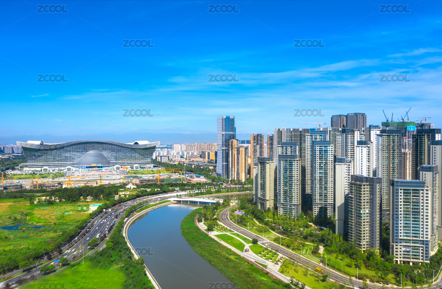 中国四川成都环球中心复地金融岛周边建筑航拍图