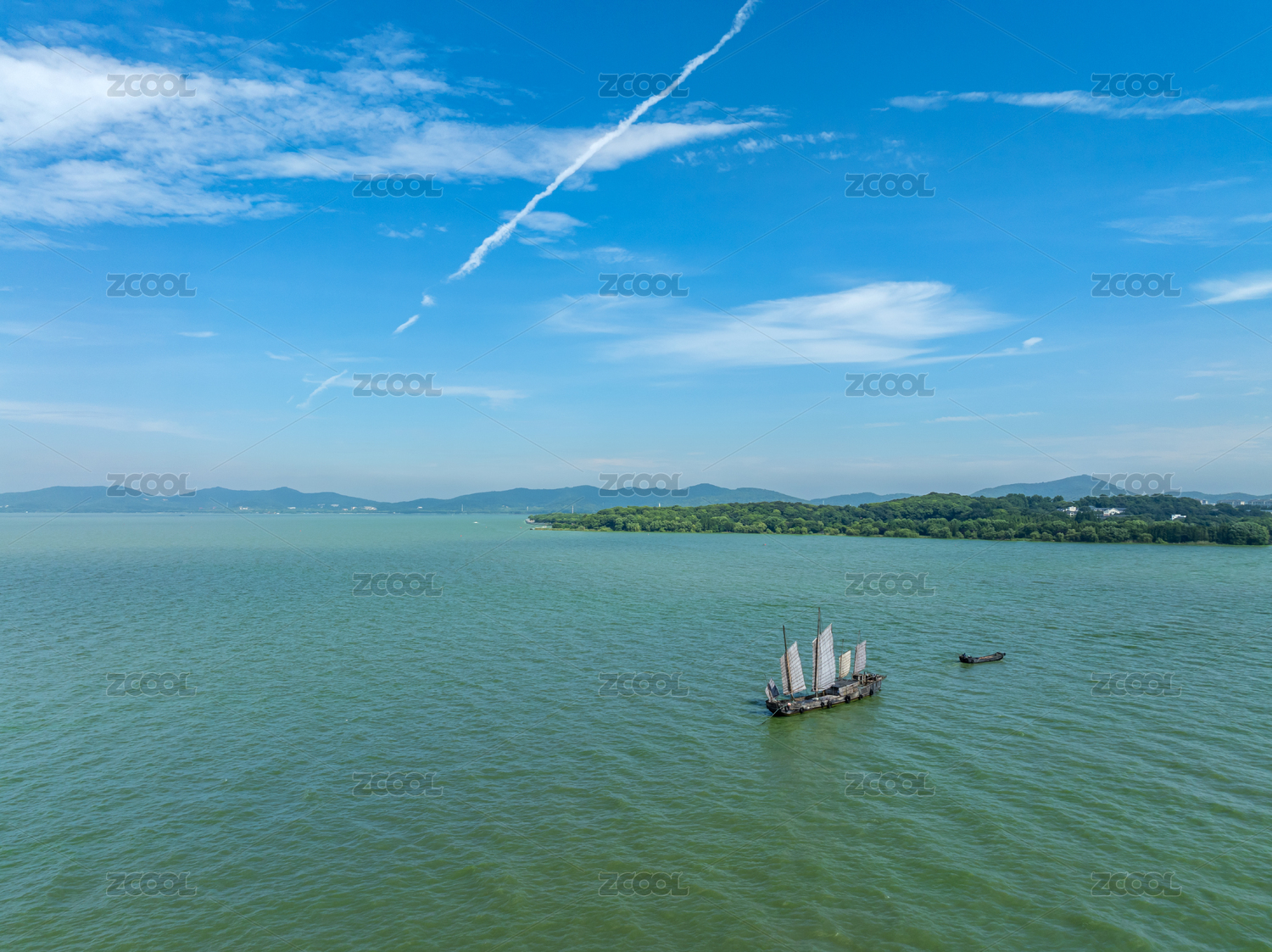 无锡市太湖鼋头渚风景区湖面上的古帆船风光