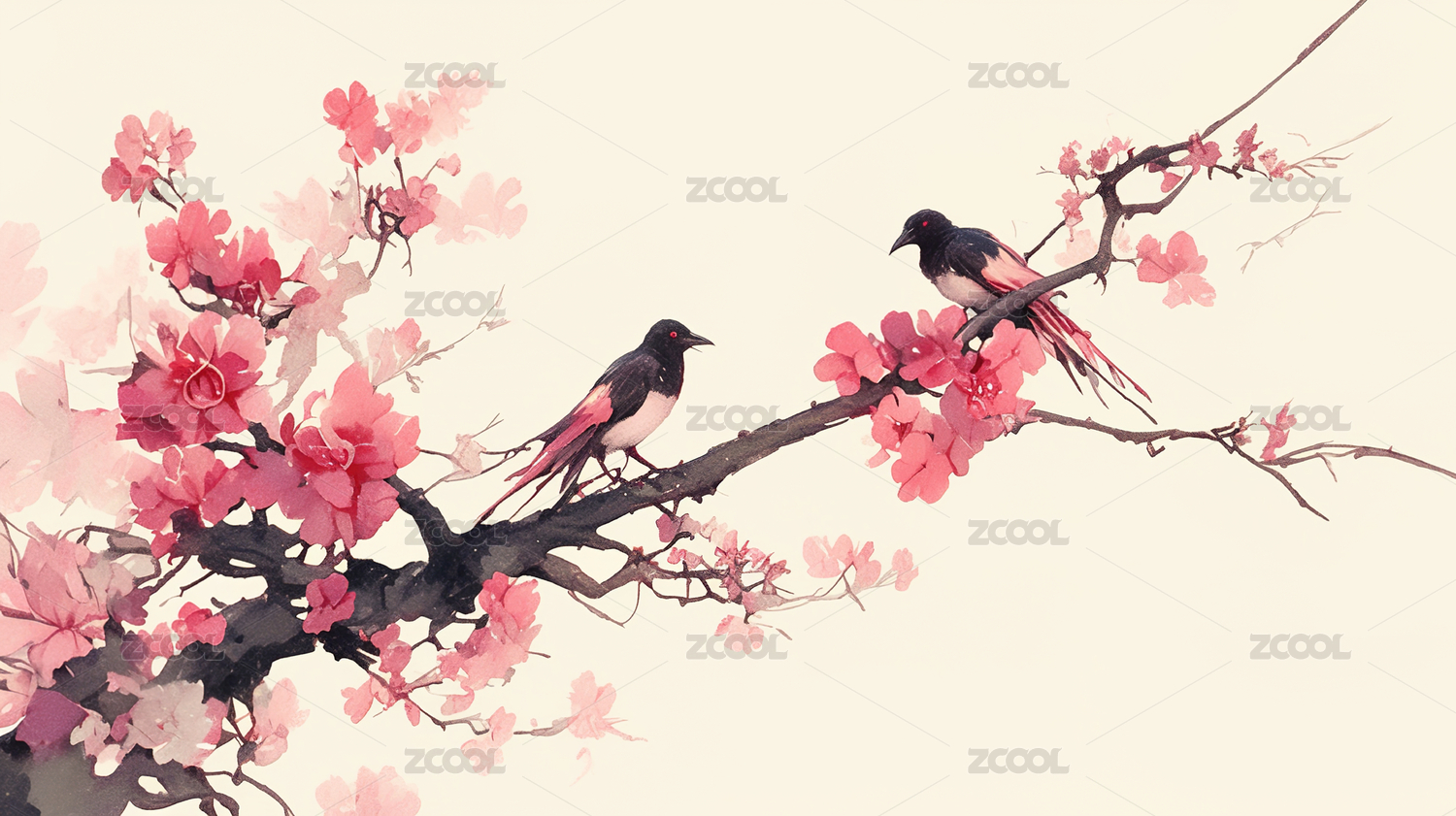 AIGC中国风喜鹊花鸟水墨画插画