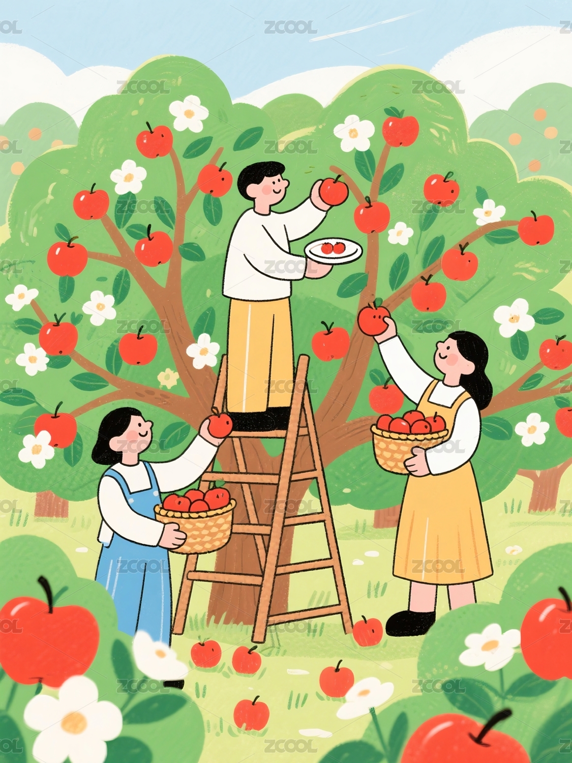 绿色柿子树可爱卡通女孩摘柿子霜降小孩