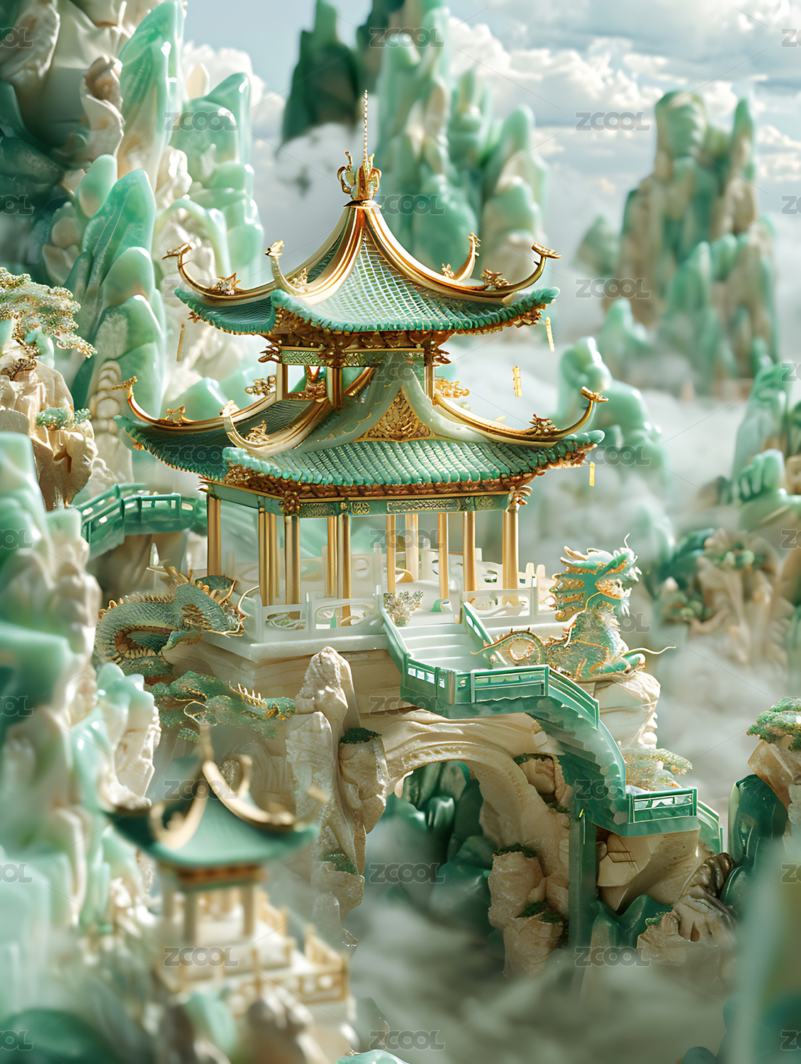 玉雕景观古建筑抽象插画海报背景