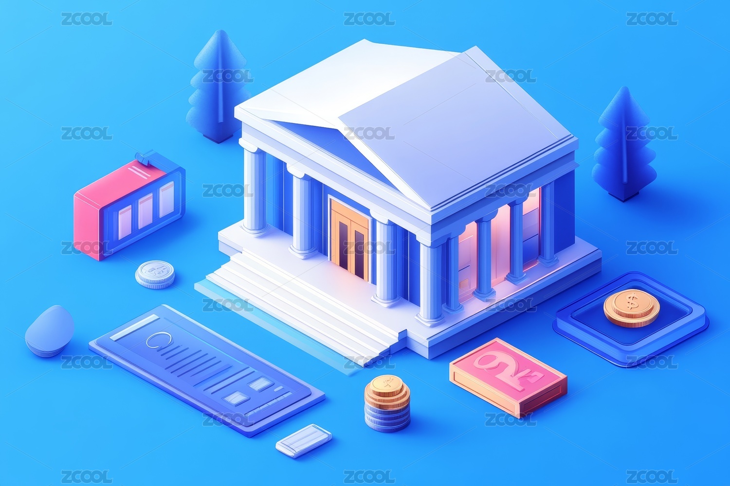 3D卡通蓝色银行建筑和金币元素