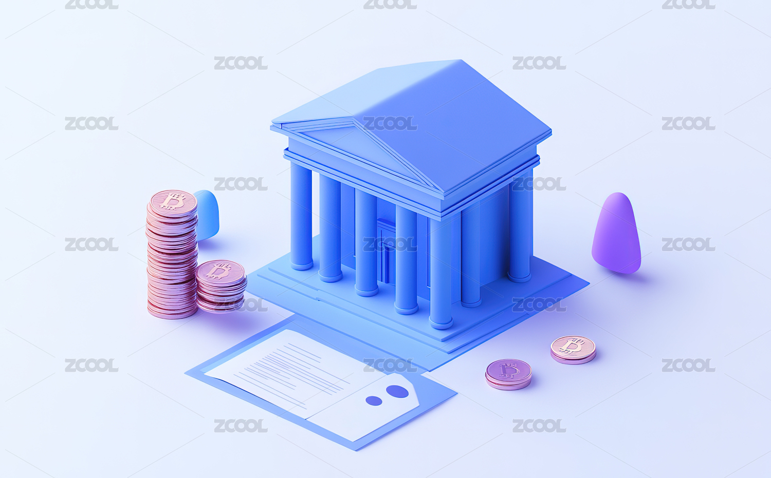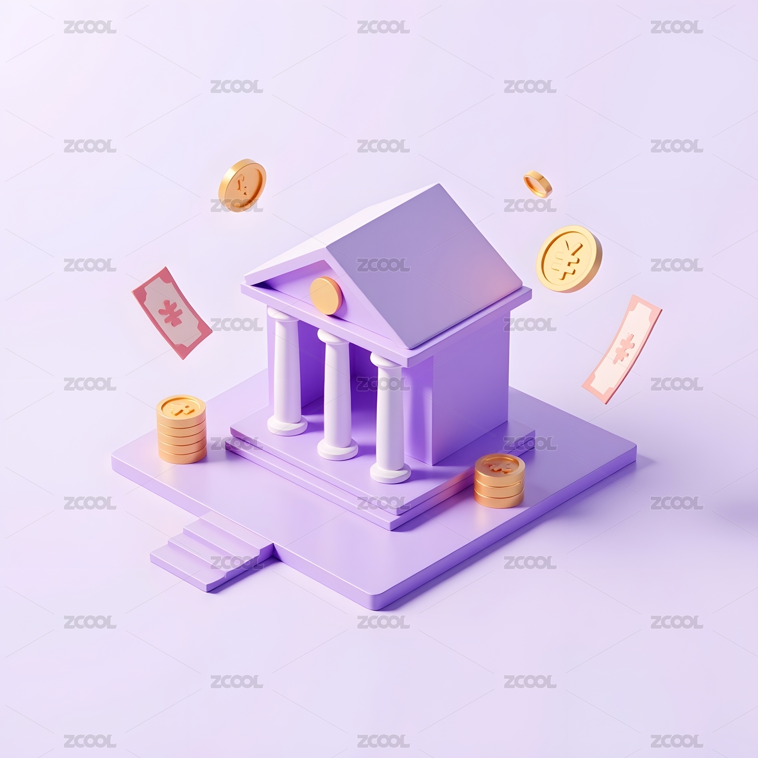 紫色银行建筑与钱币