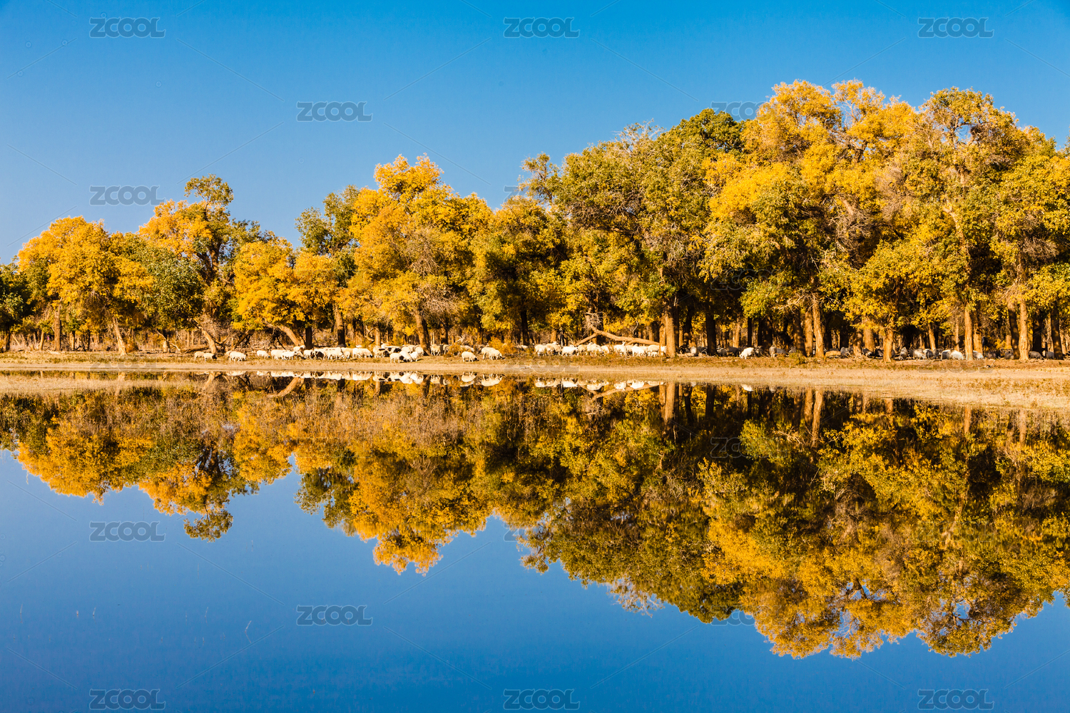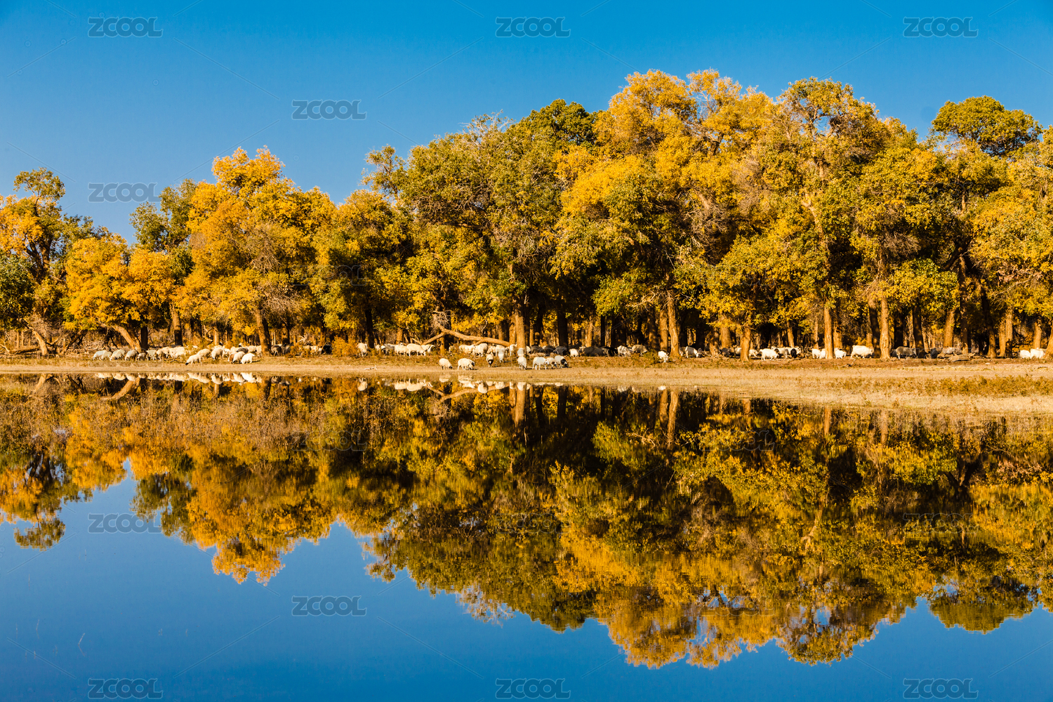 中国内蒙古阿拉善胡杨羊群水面对称倒影