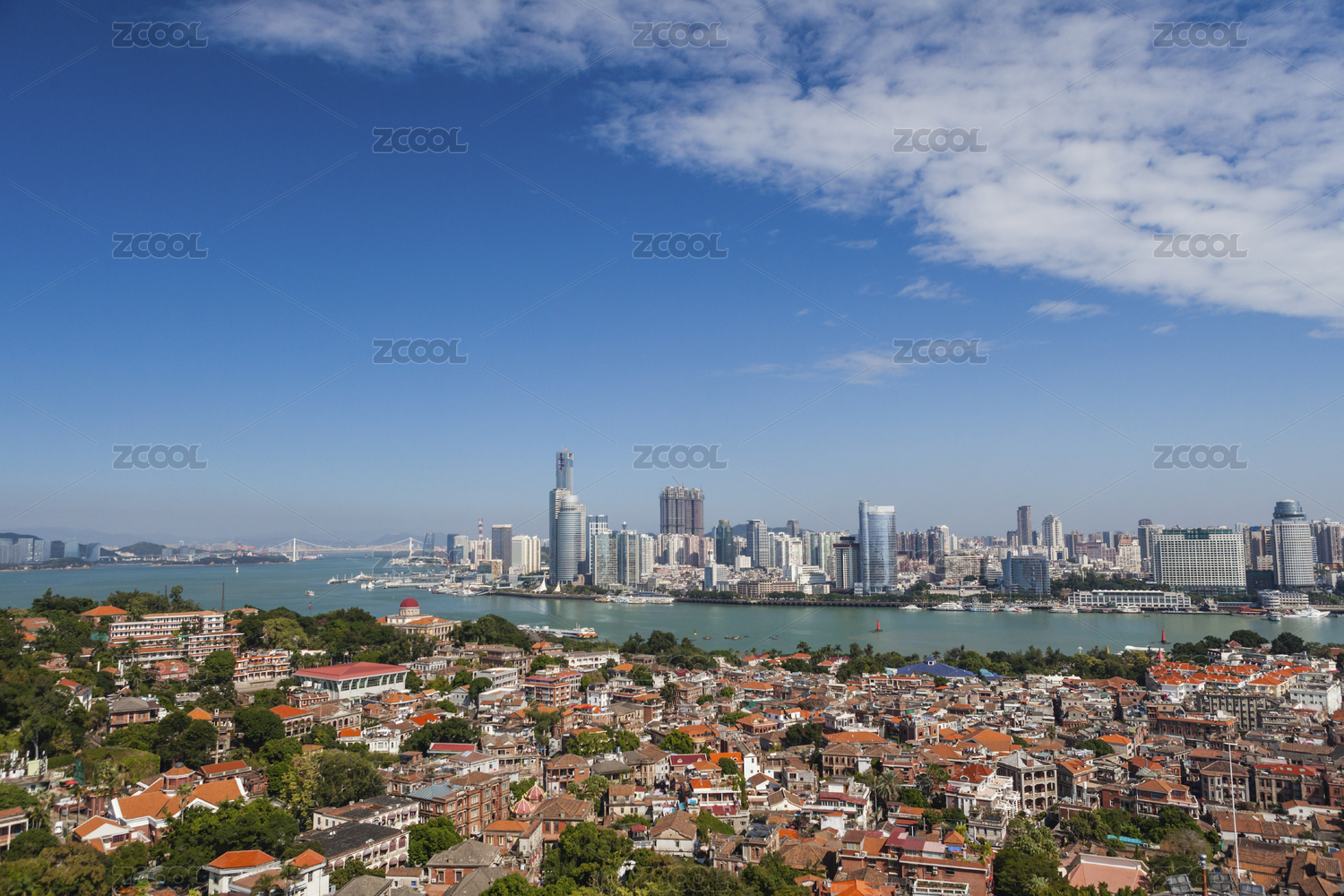 中国福建省厦门市鼓浪屿西式建筑俯视全景图及厦门市区现代建筑