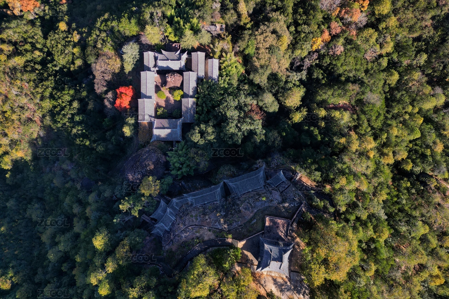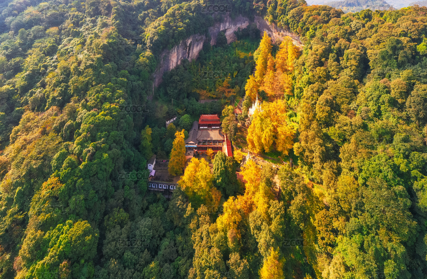 中国四川成都青城山老君阁冬季彩林风光航拍