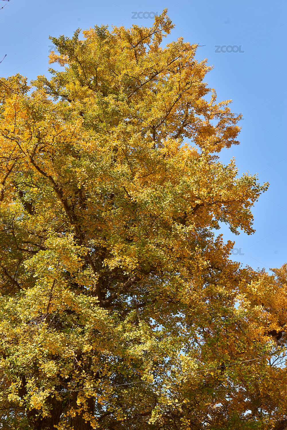 秋天的银杏林,金色的银杏叶及湛蓝的天空