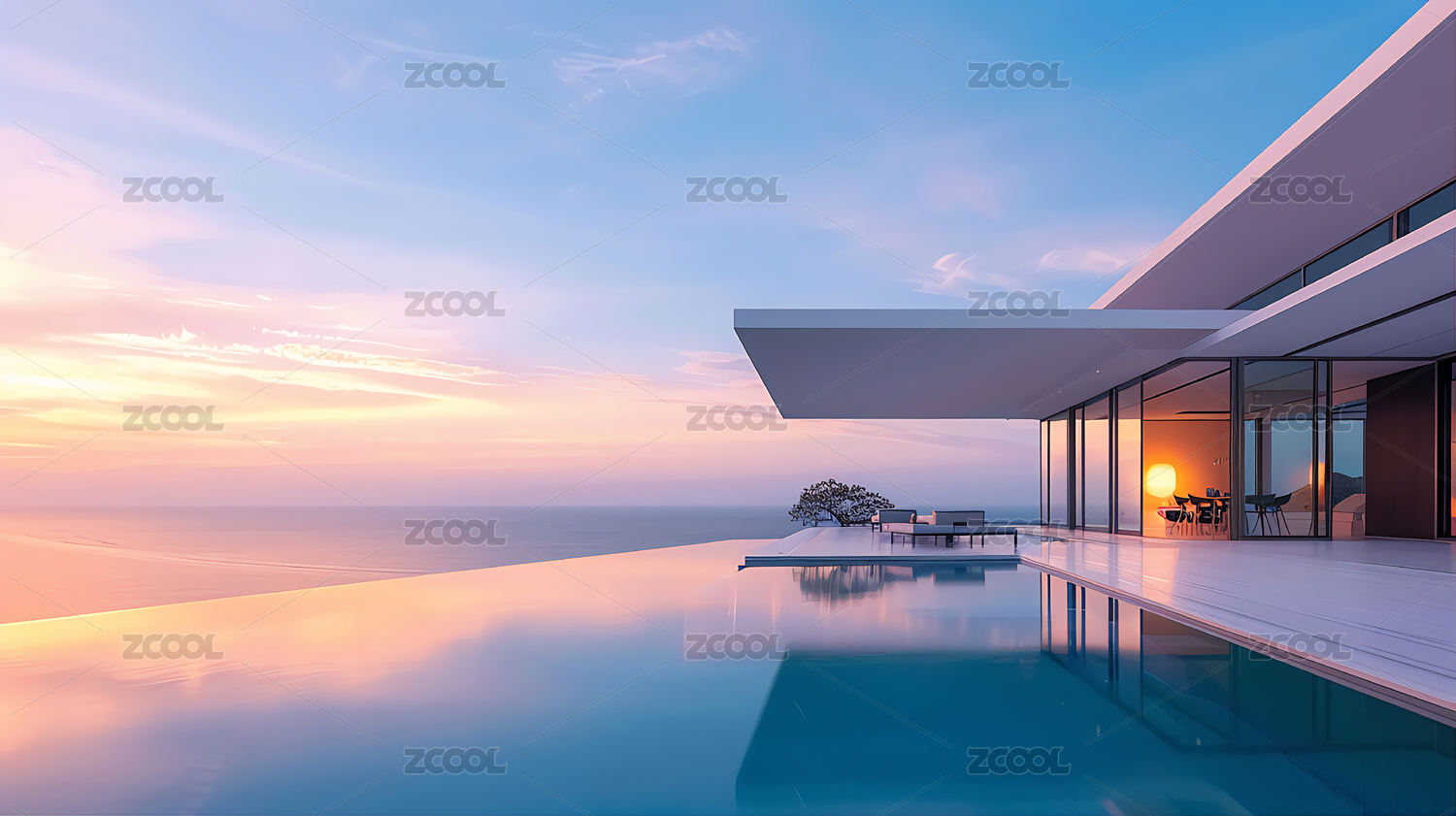 夕阳下的别墅海边现代建筑内部景观无边泳池