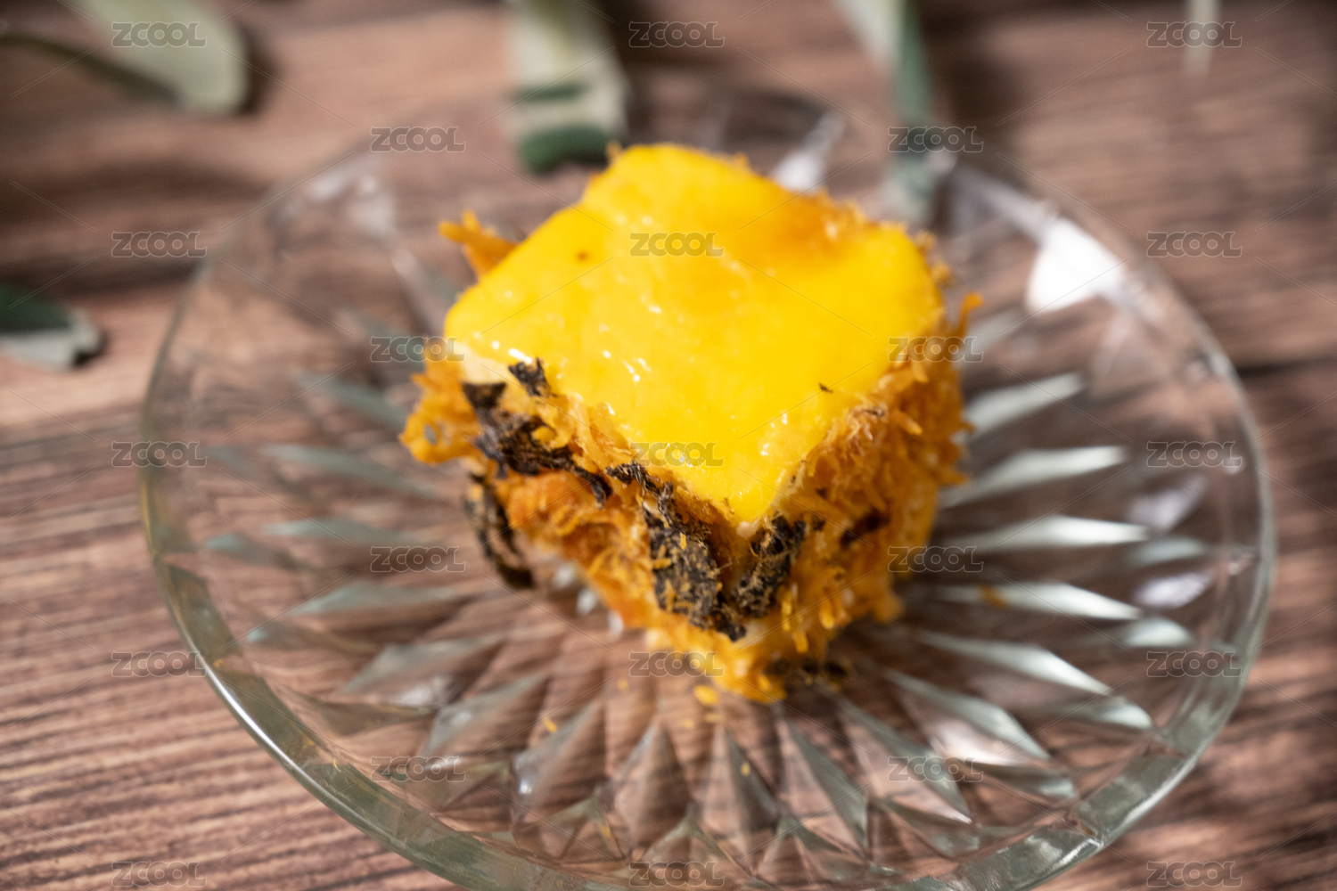 桌面上的盘子里的美味可口的芝士肉松蛋糕
