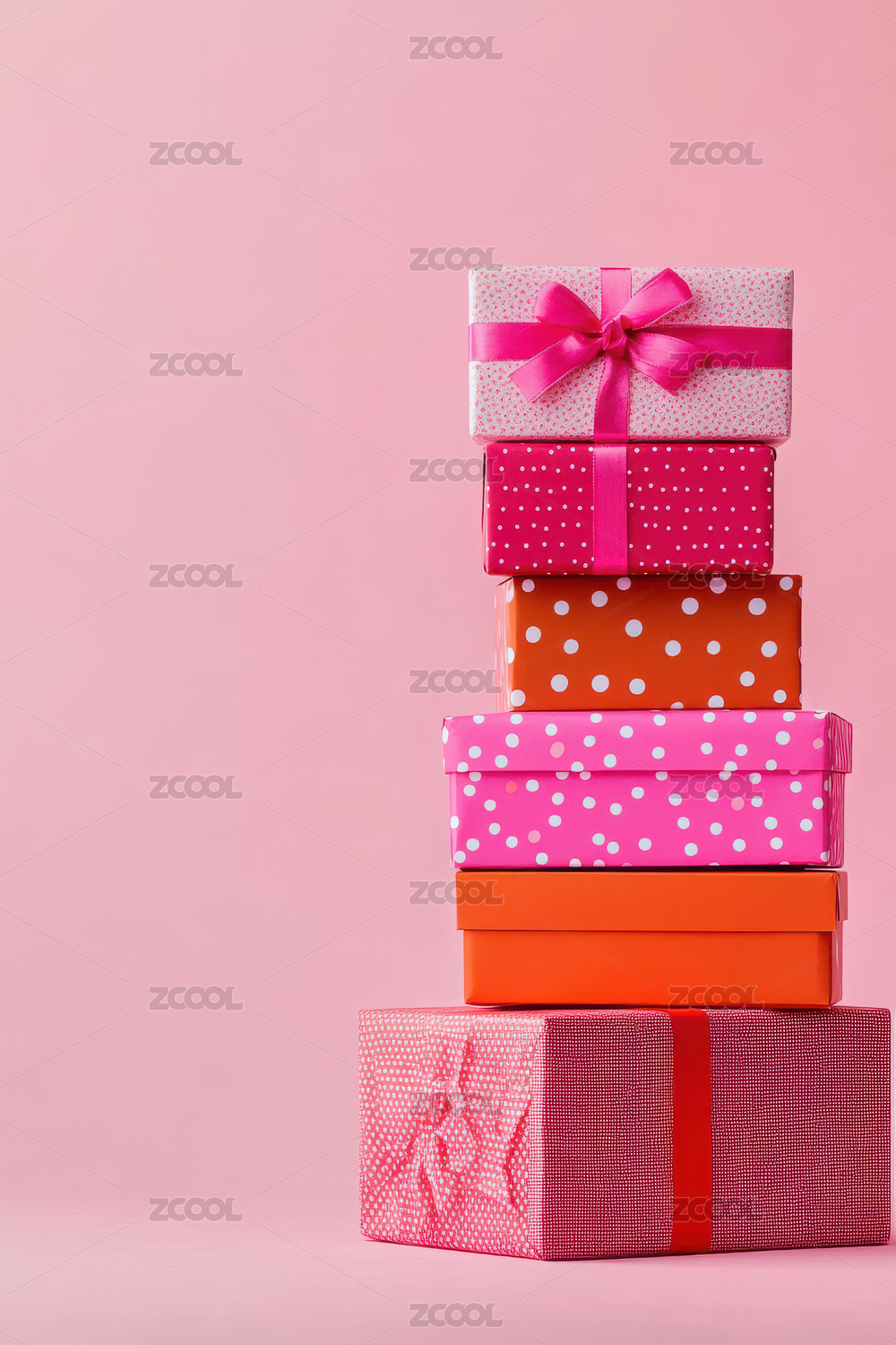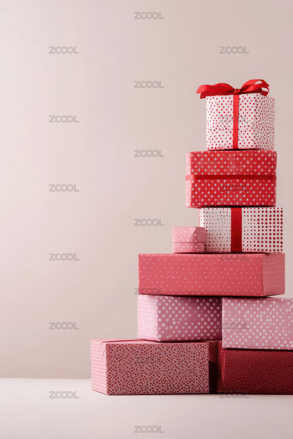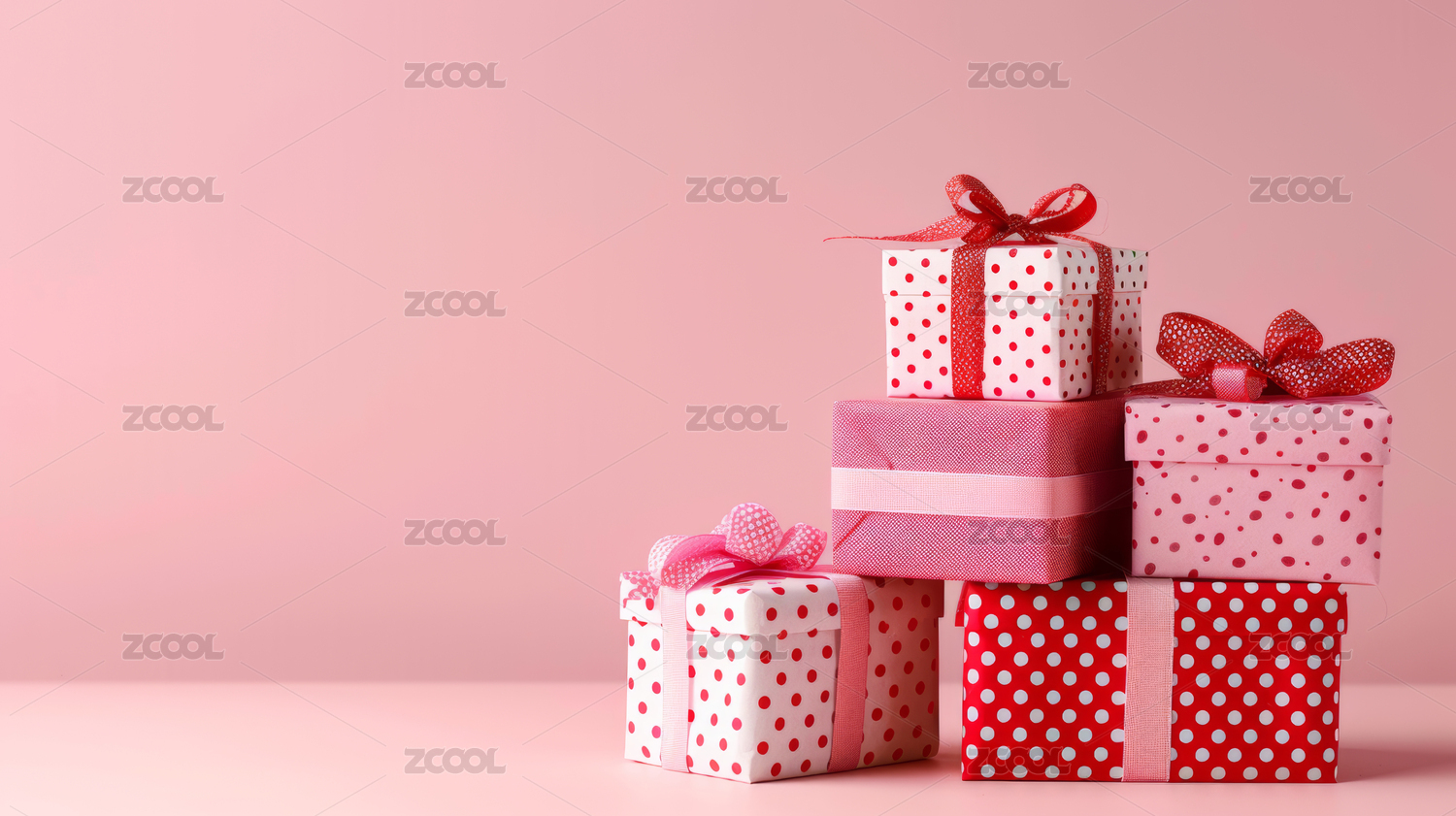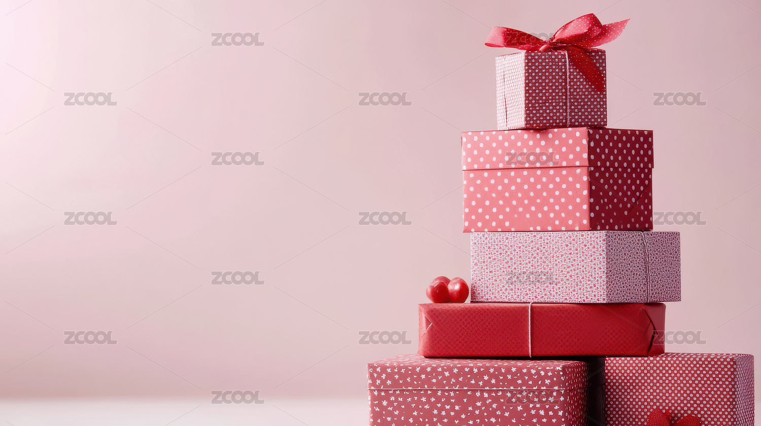 干净背景上堆砌的红色和粉色波点礼物盒