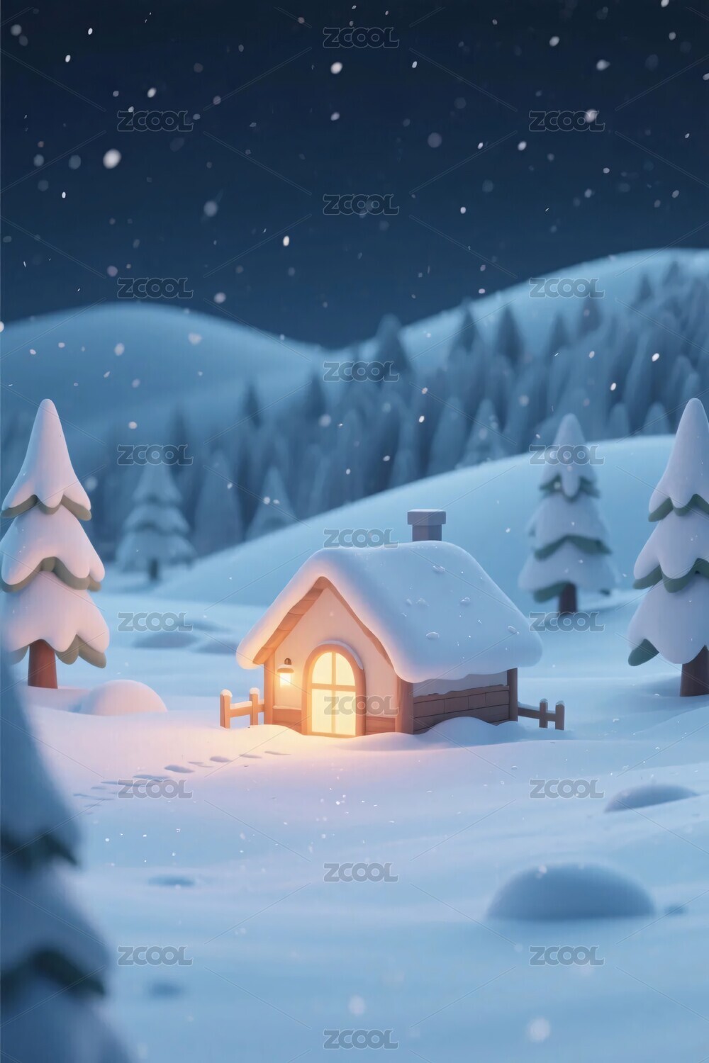 冬季,雪景,插画,冬天,雪花,雪,蘑菇,房屋,灯光,温馨