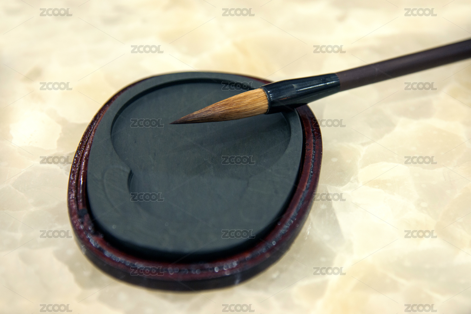 桌面上的毛笔宣纸砚台印章等文房四宝