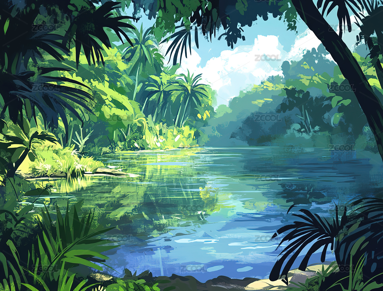 手绘卡通热带雨林插画背景