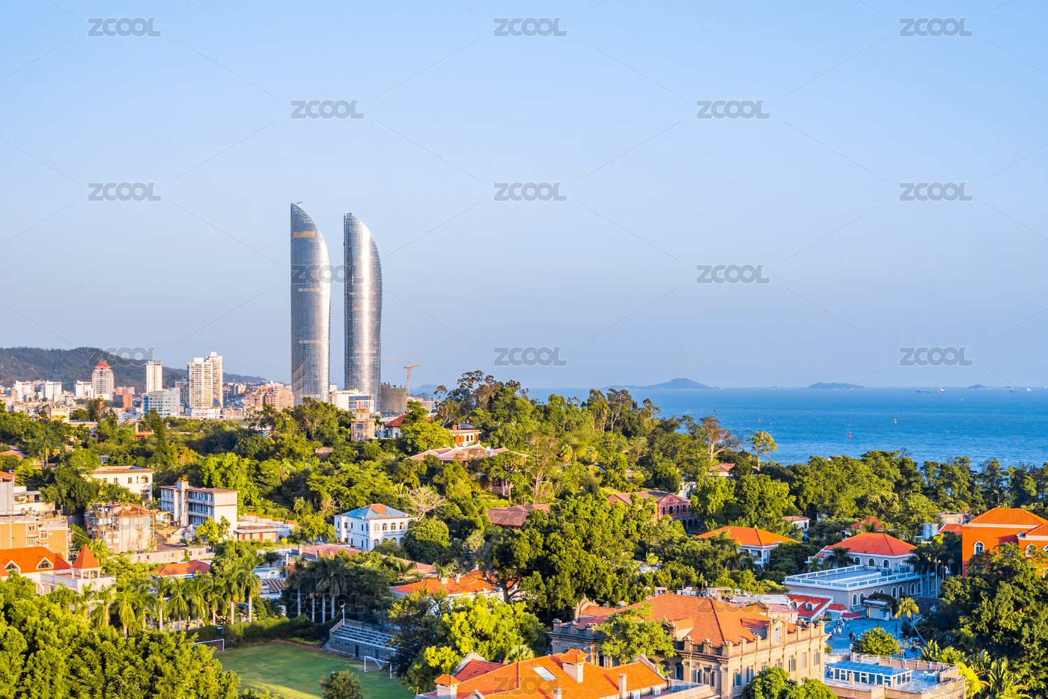 中国福建厦门双子塔和鼓浪屿晴天风光