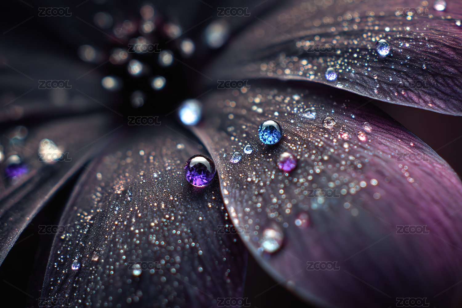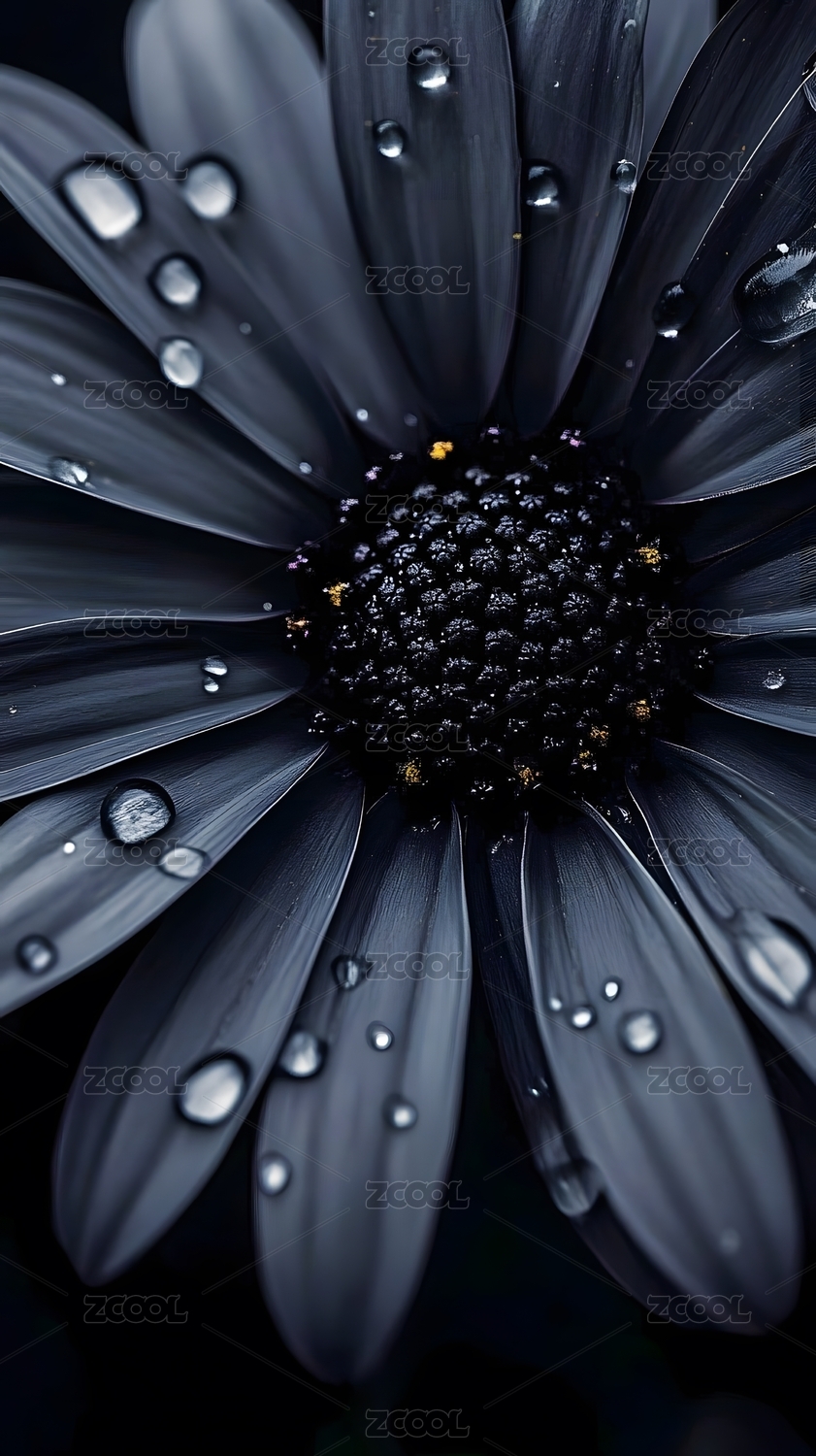 深蓝花朵上的水珠特写