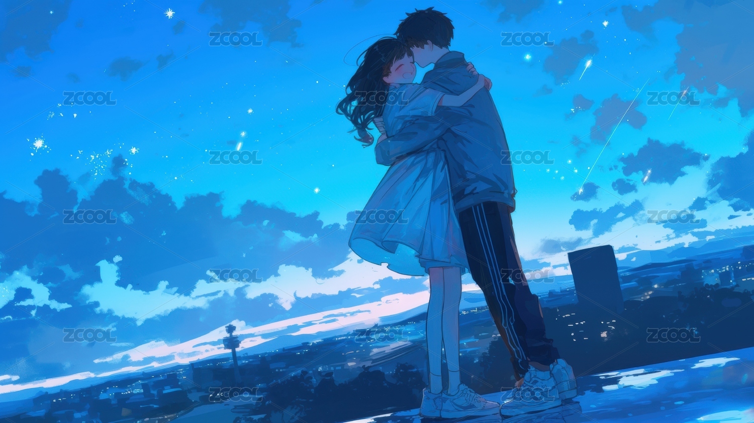 少女,围栏,城市,草丛,天空,唯美,少年,情侣