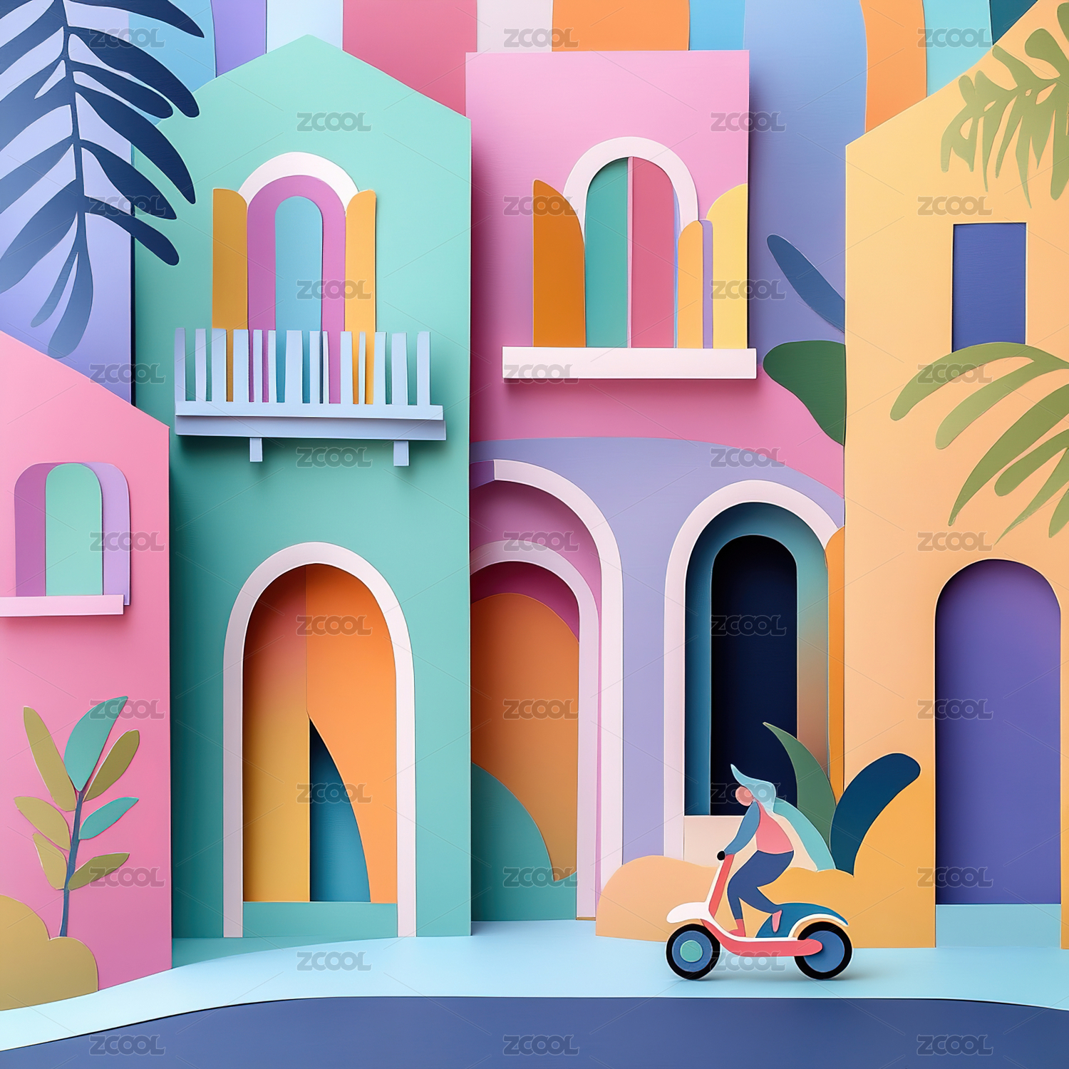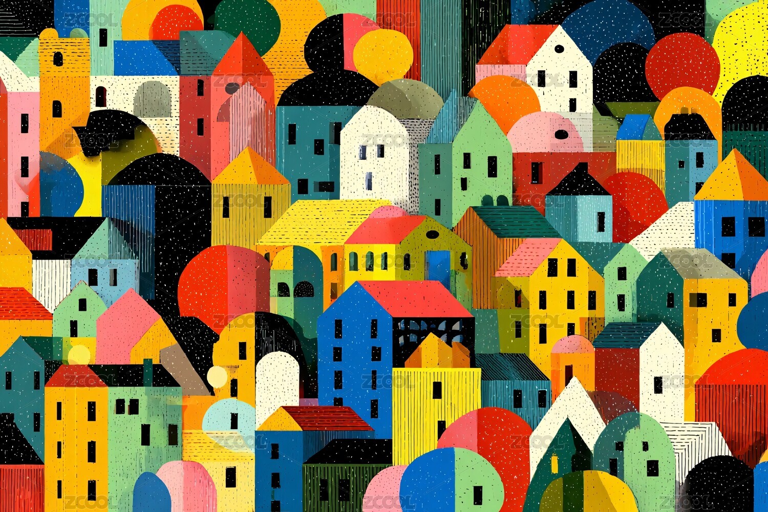 城市街景,建筑,彩色,几何,抽象,房屋,自行车,人物,现代艺术,设计