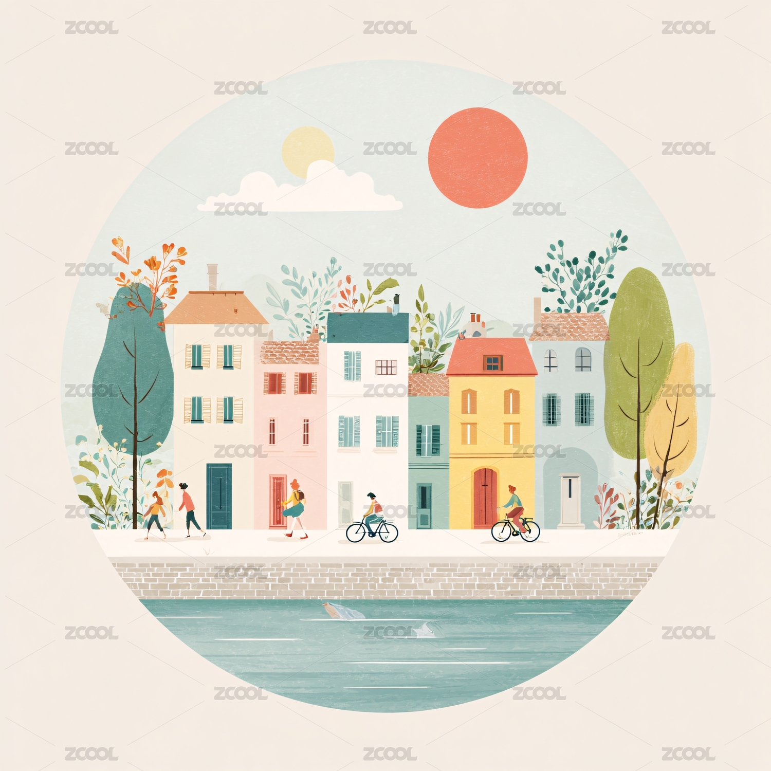 彩色小镇河畔生活插画