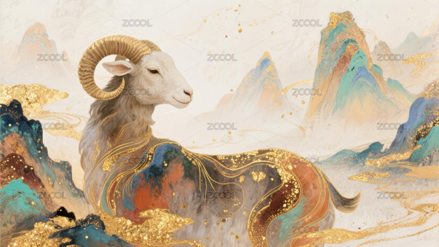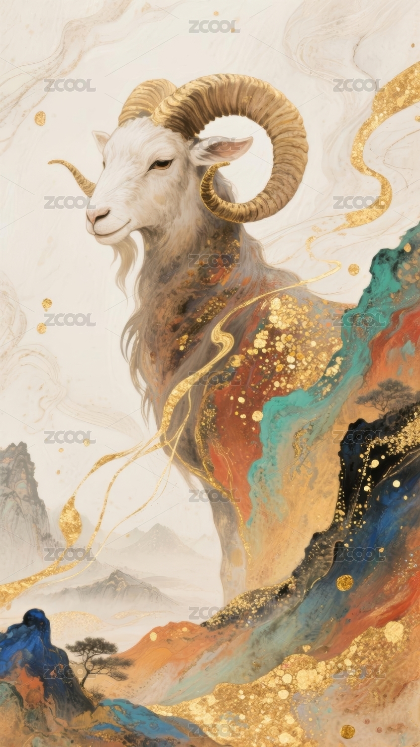 瑞羊国潮风山水装饰场景