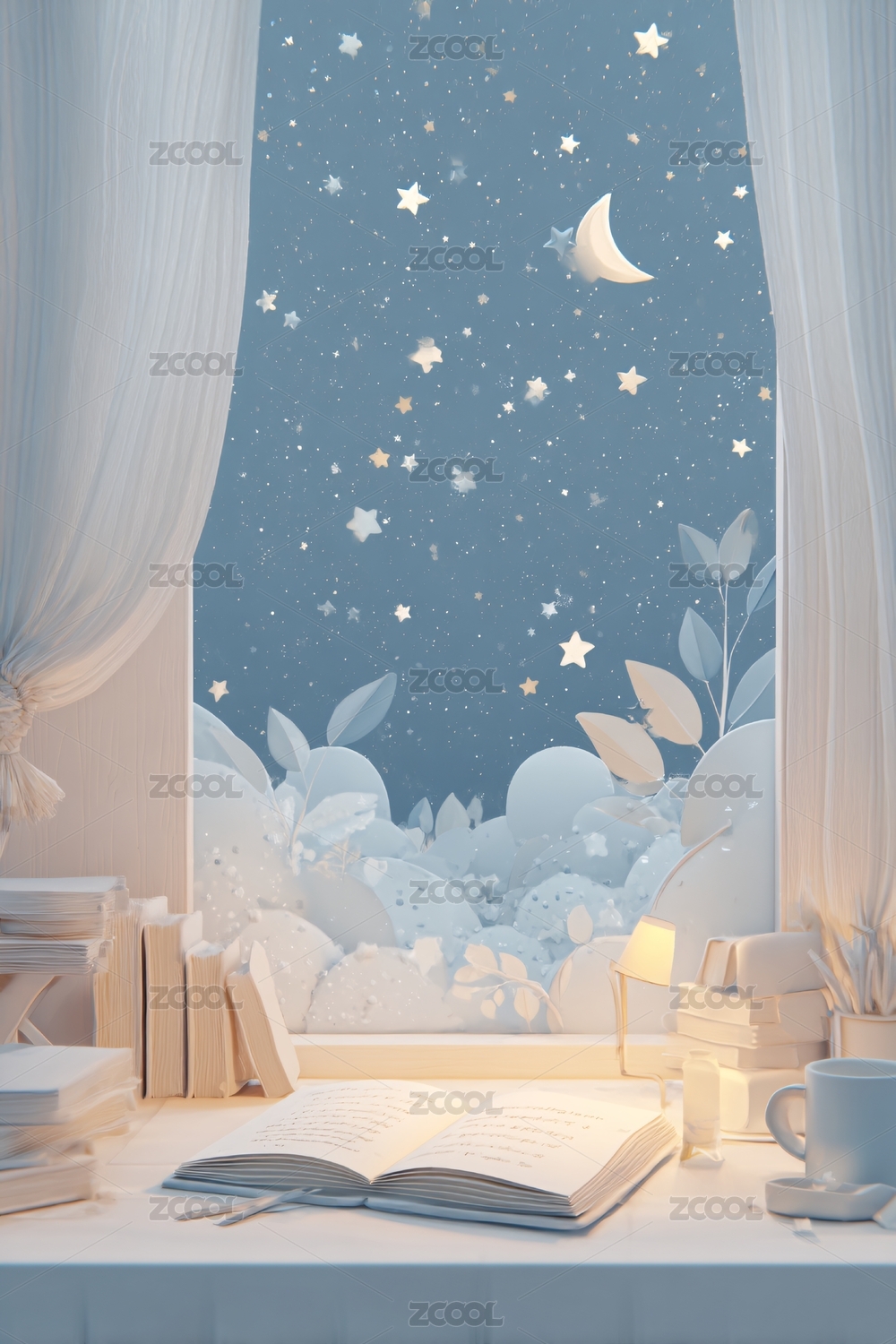 窗前月夜读书静谧插画