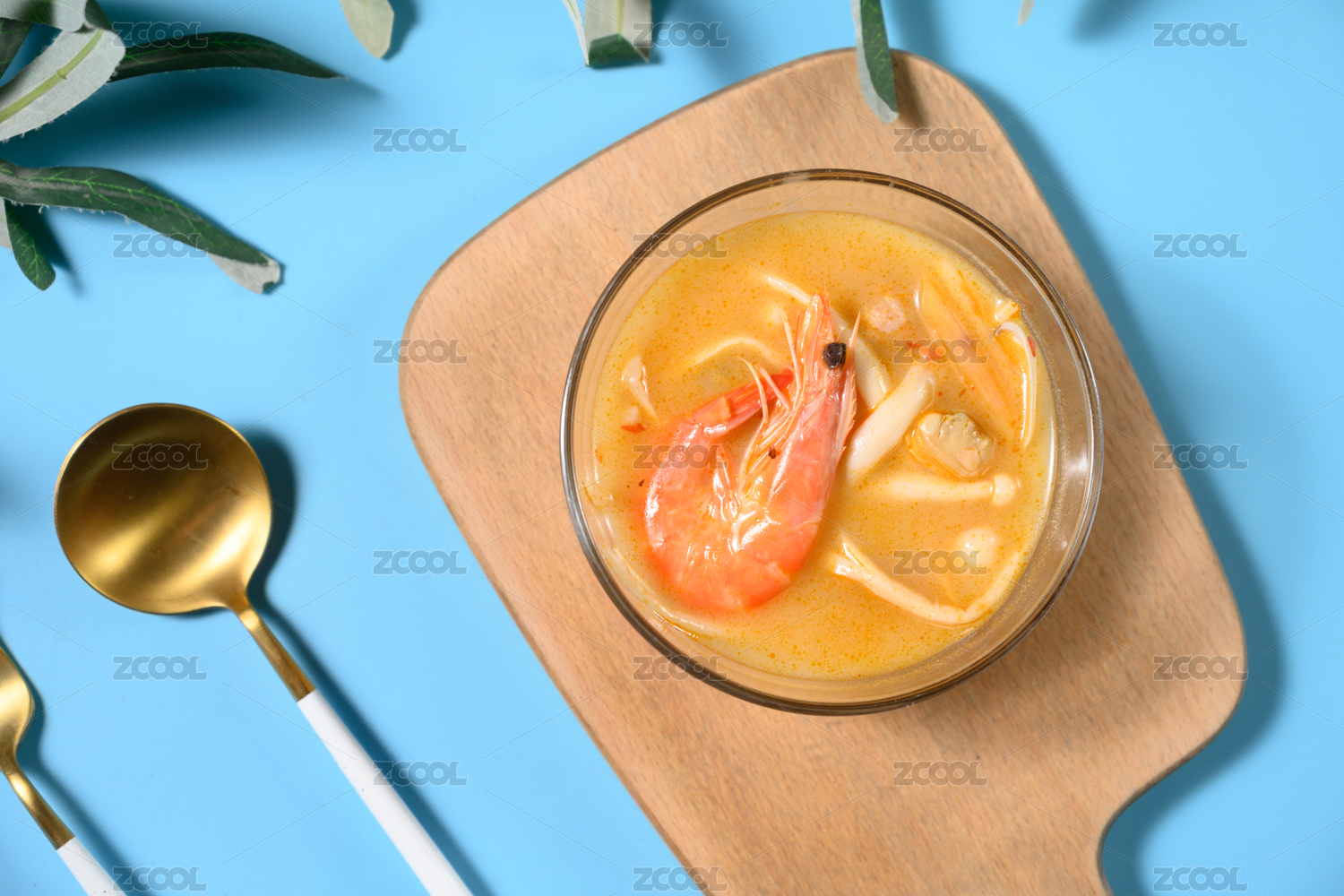 桌面上的碗里的美味可口的清汤鱿鱼圈