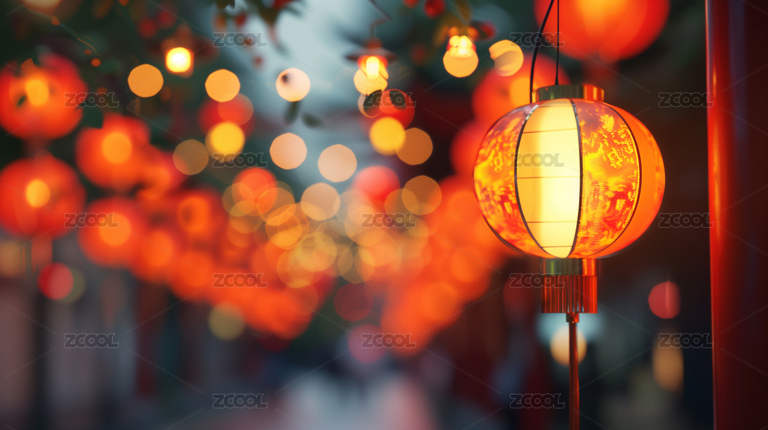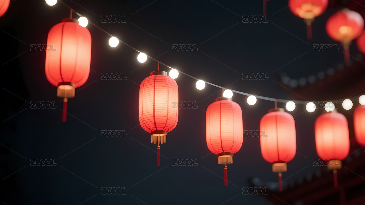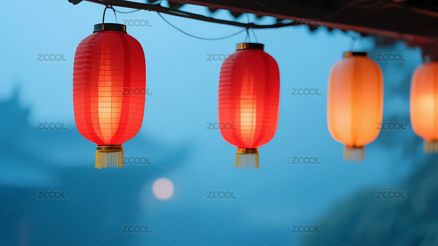 夜晚挂着传统红灯笼的中国古典建筑插画绘画