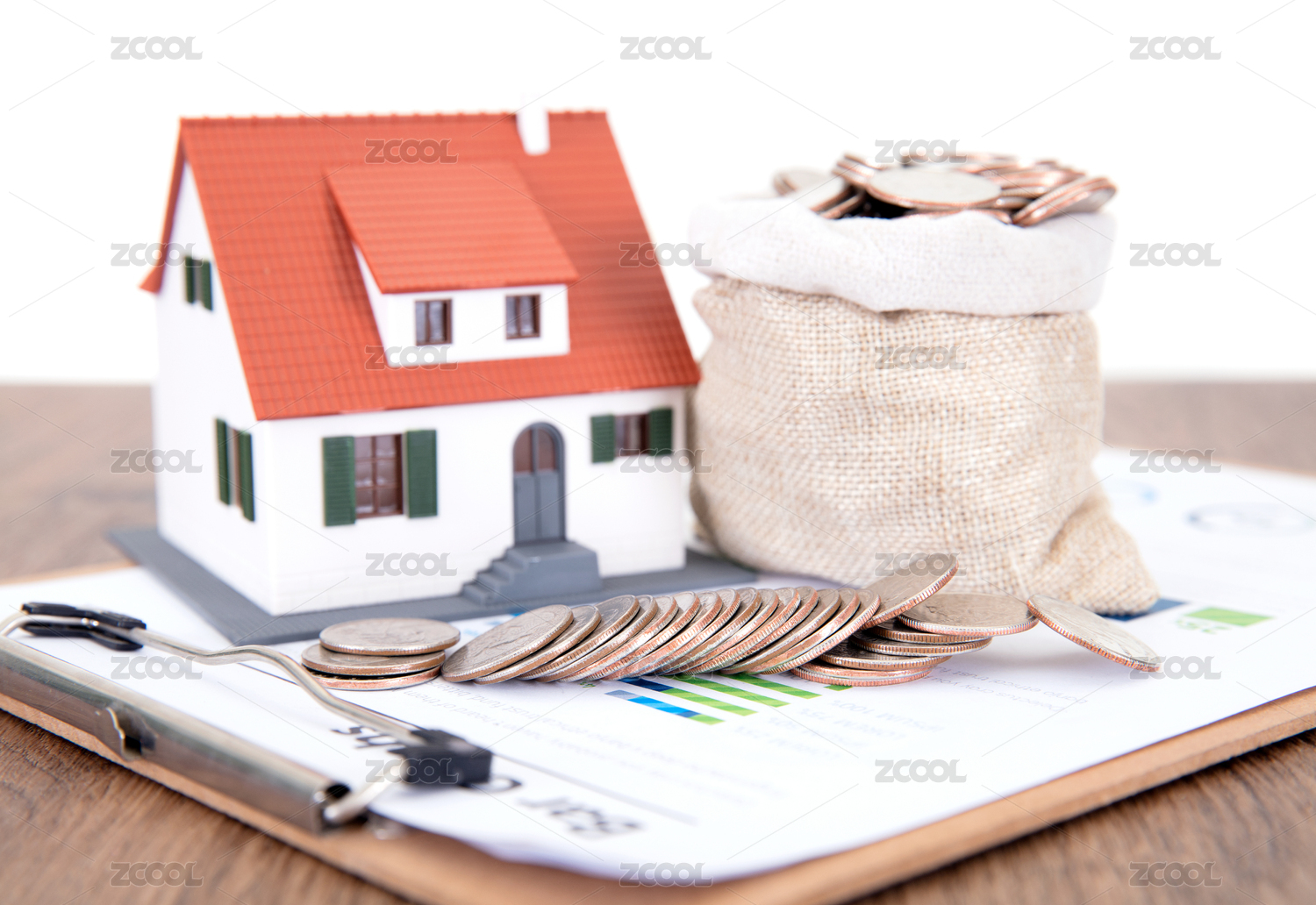 小房子模型和计算器及文件资料和一袋子美元硬币