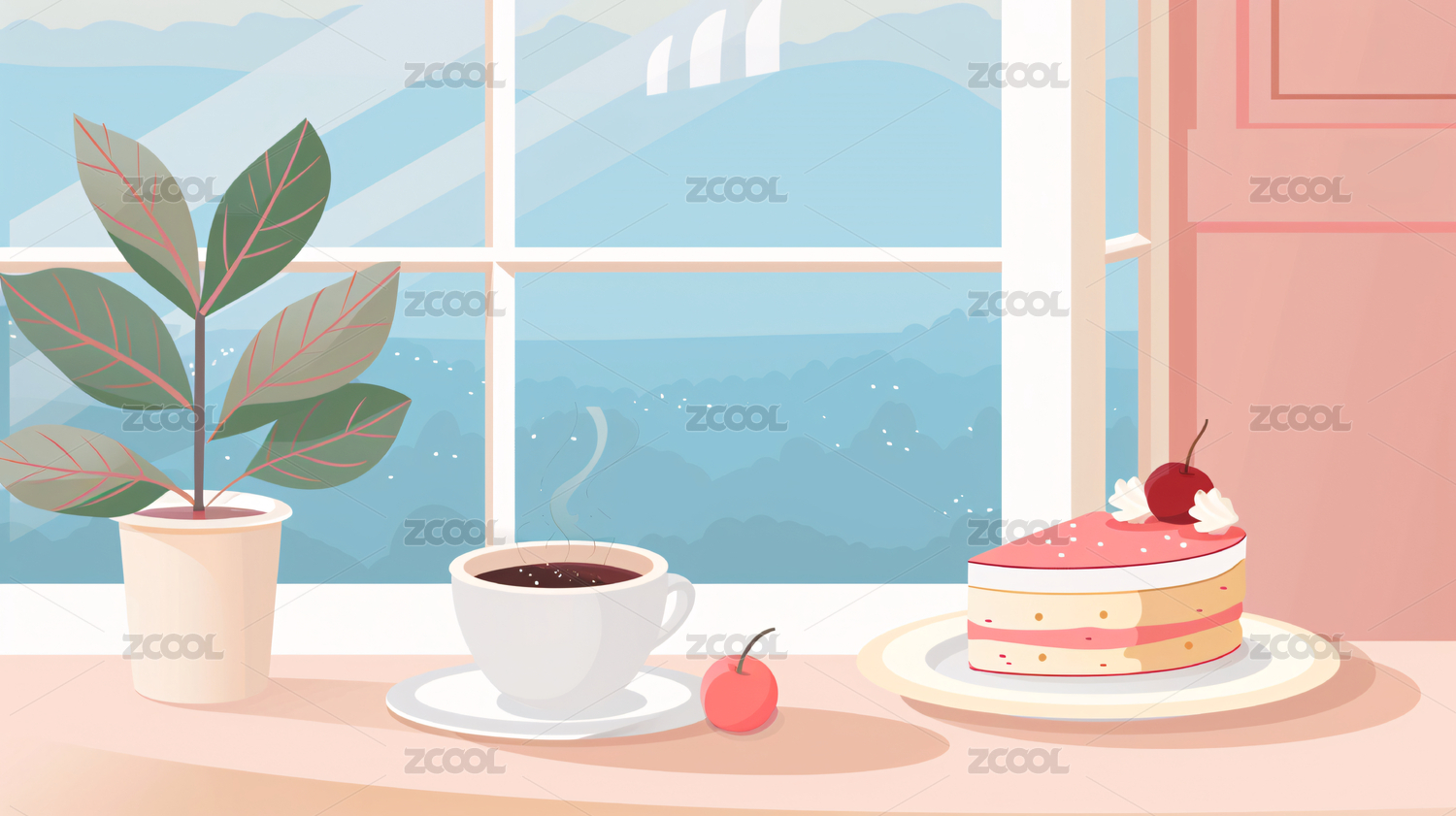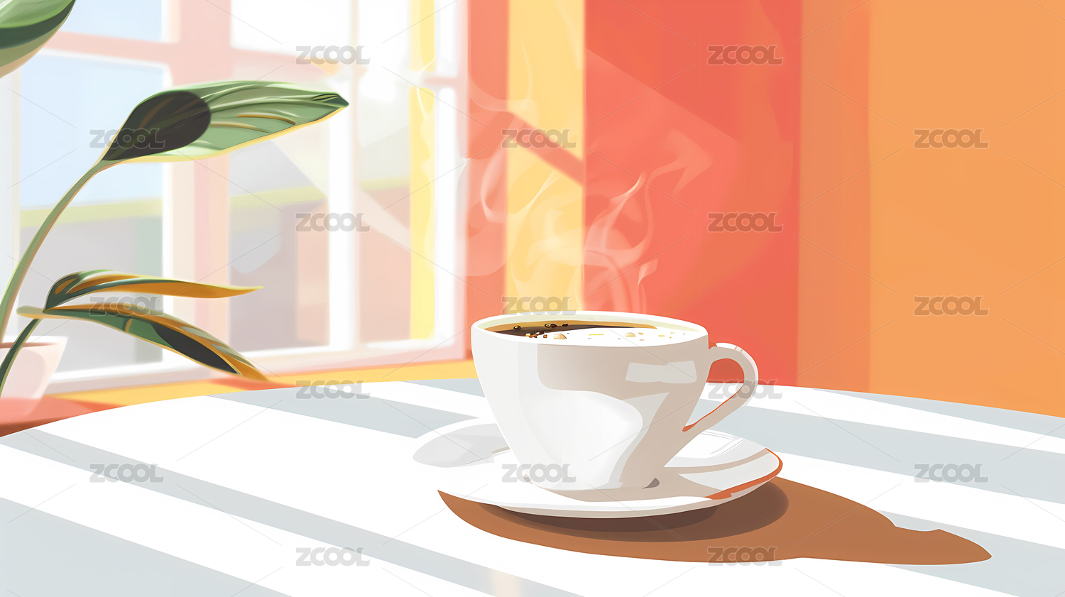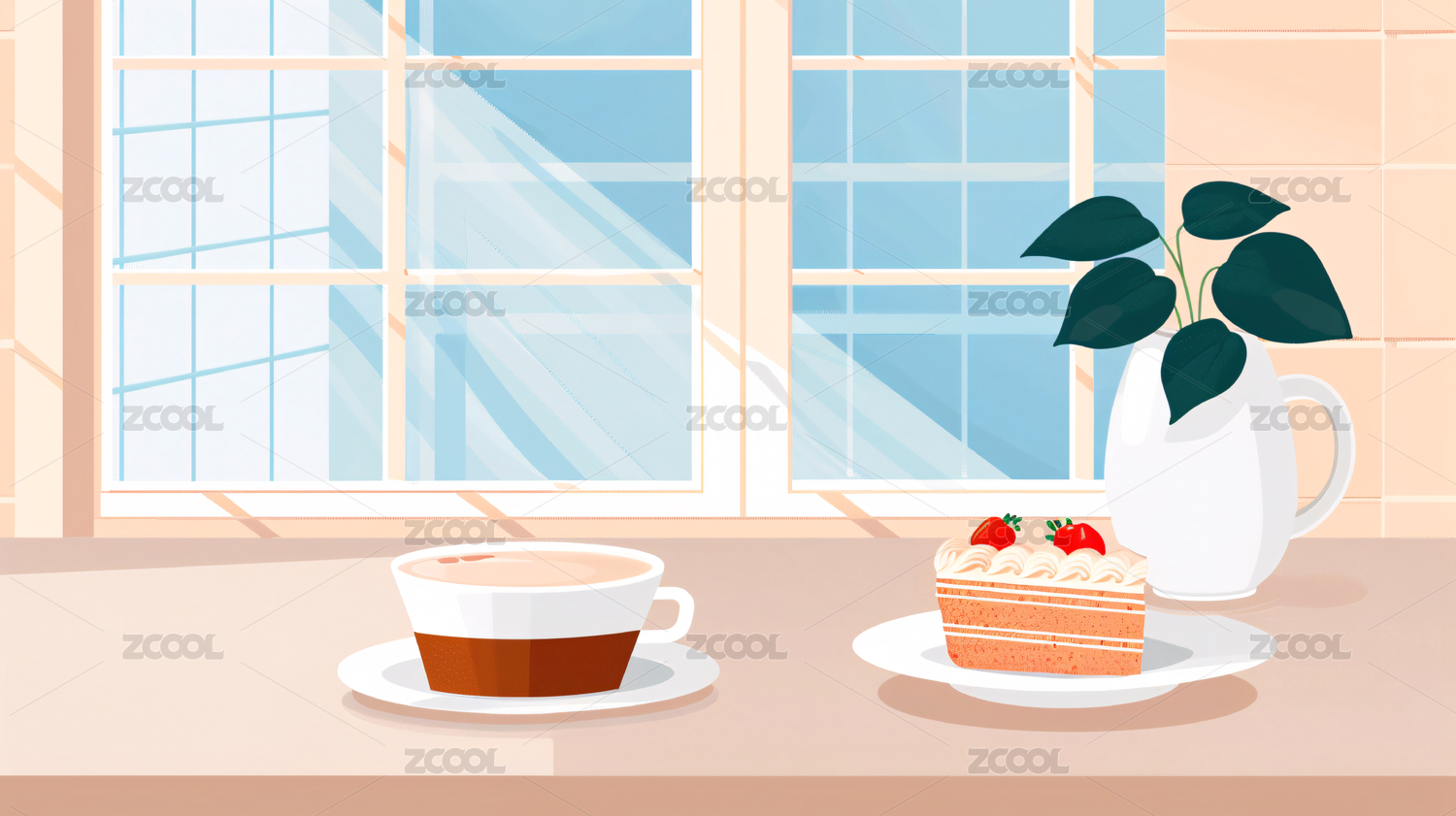 窗前桌上咖啡悠闲时光插画壁纸