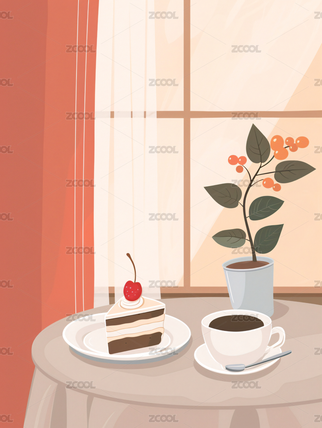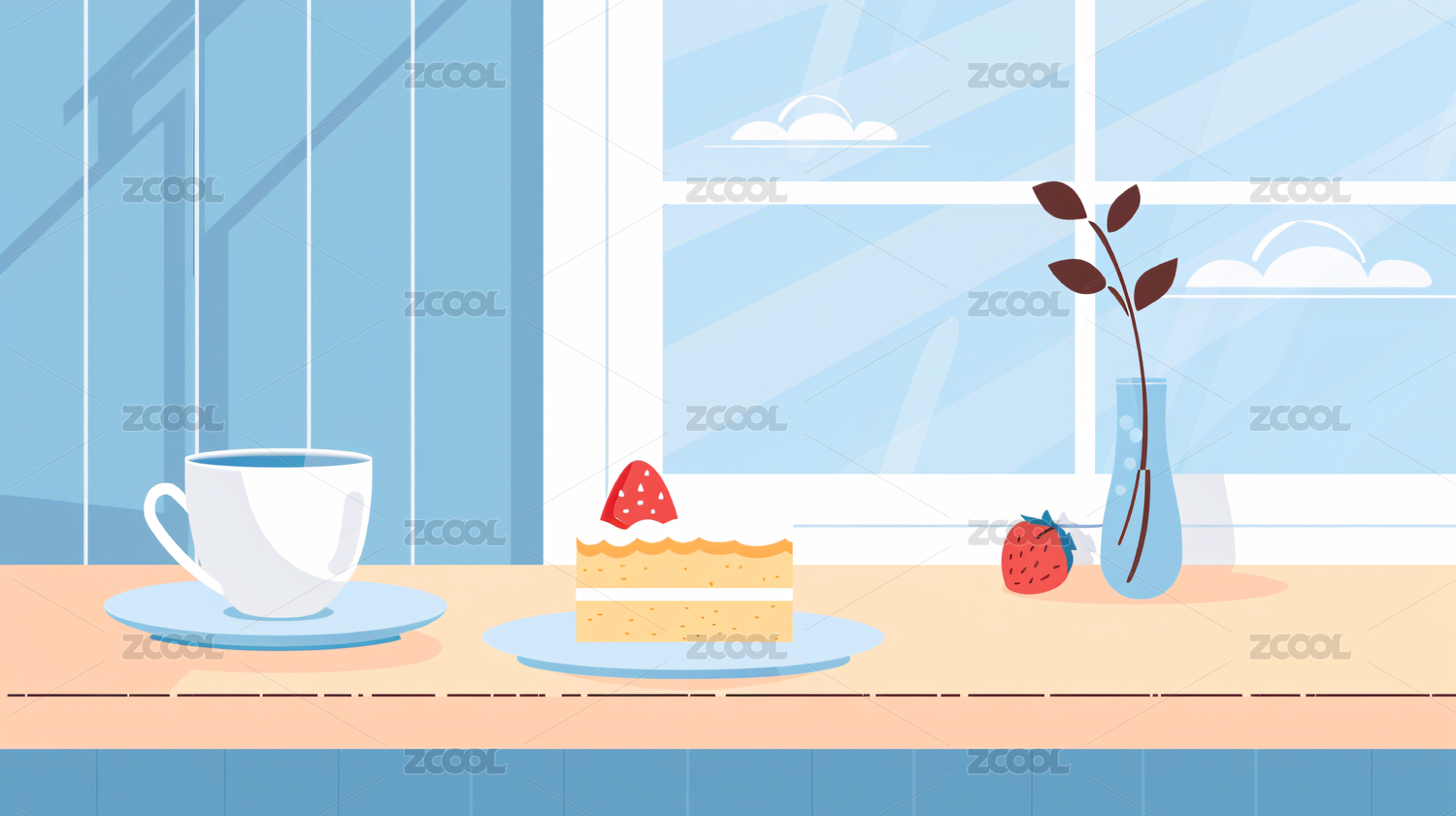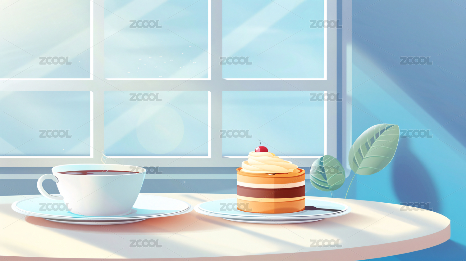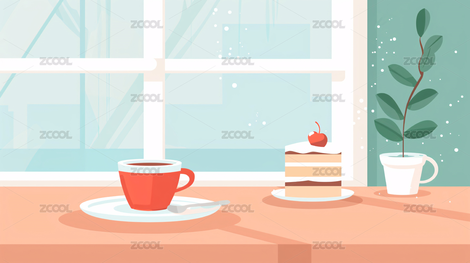 窗前桌上咖啡悠闲时光插画壁纸
