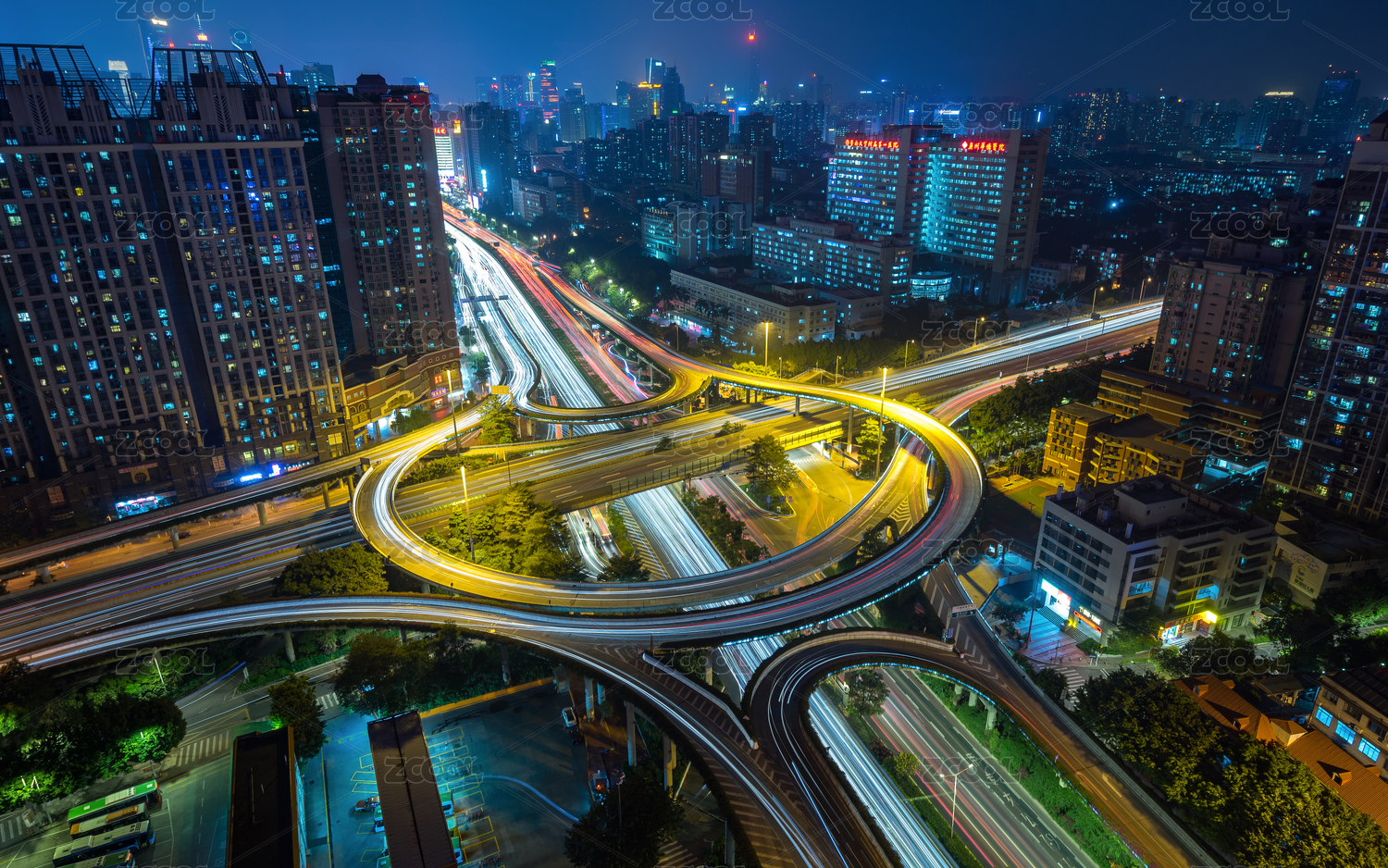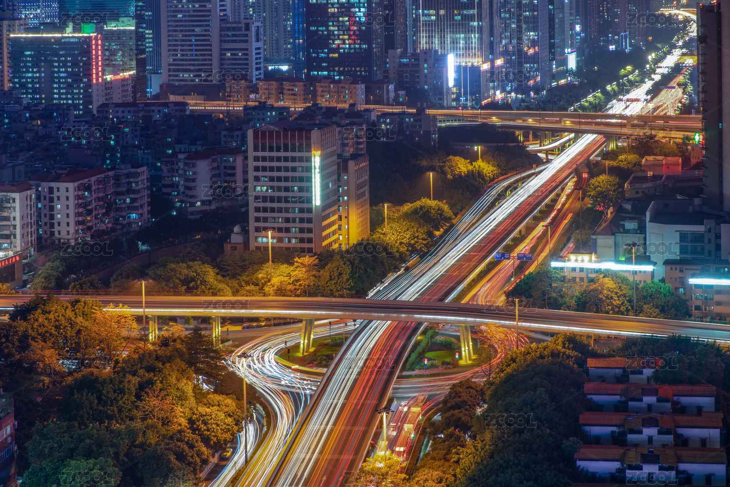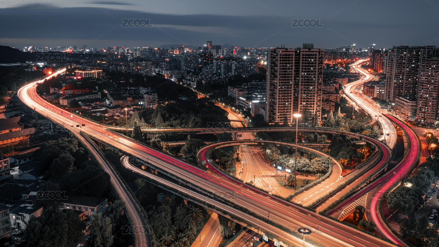 傍晚时分的城市立交桥夜景和繁忙的车流