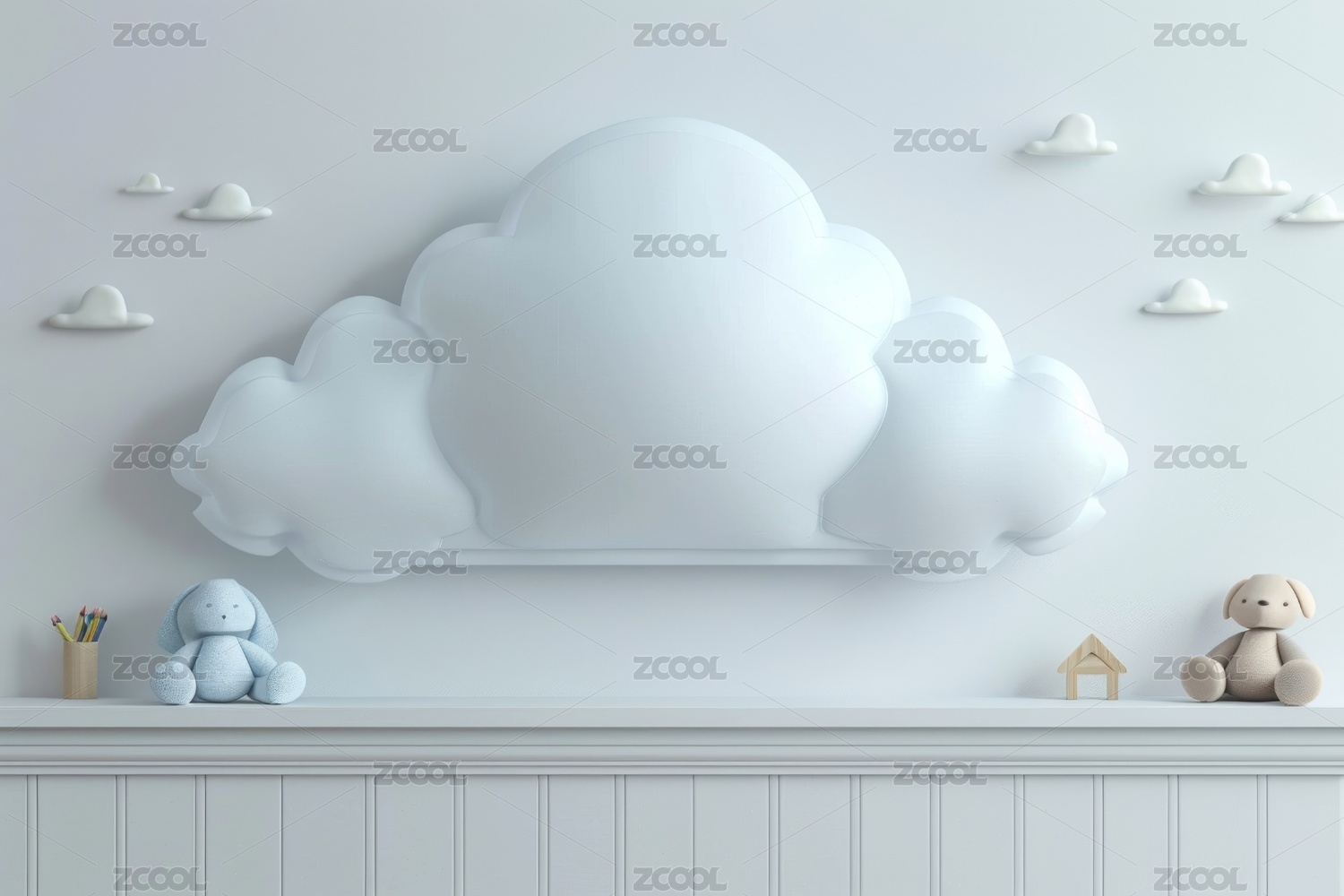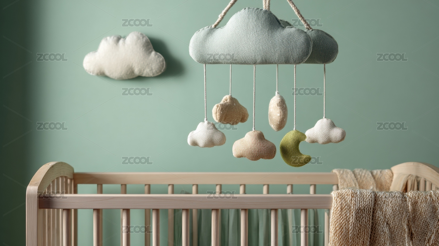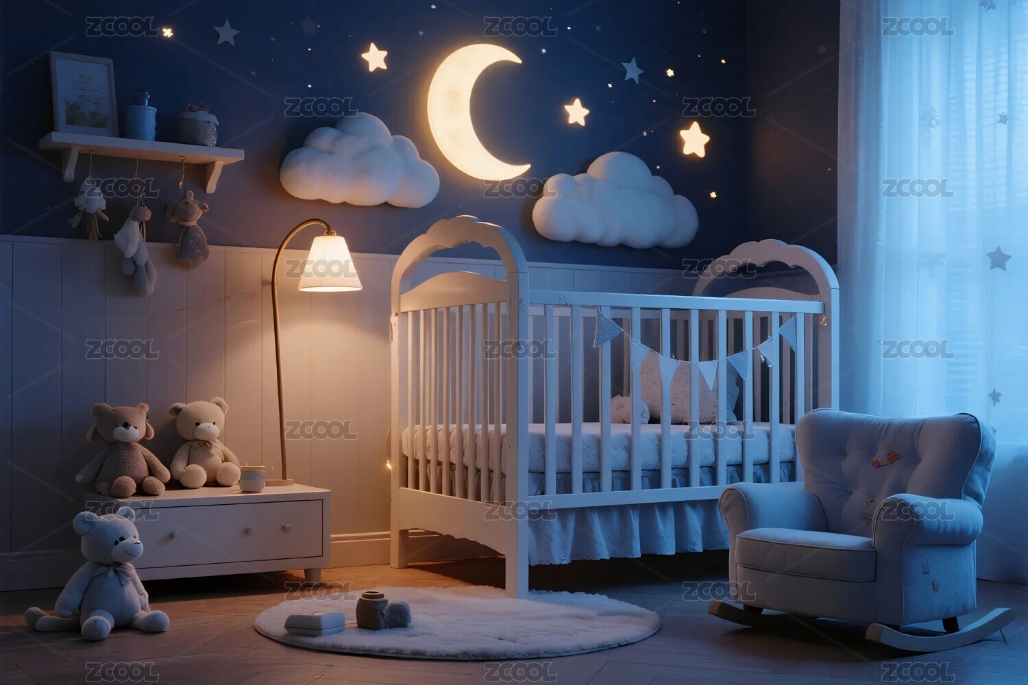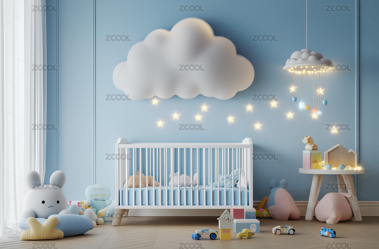 温馨蓝色婴儿房里云朵吊灯与白色婴儿床