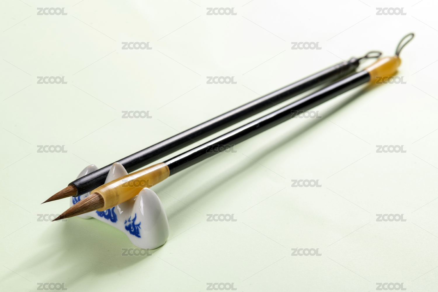 两支毛笔架在笔架上特写旁边放有宣纸