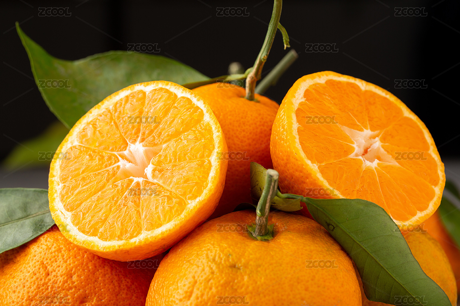 黑底上木盘里放着一堆砂糖橘和切面砂糖桔