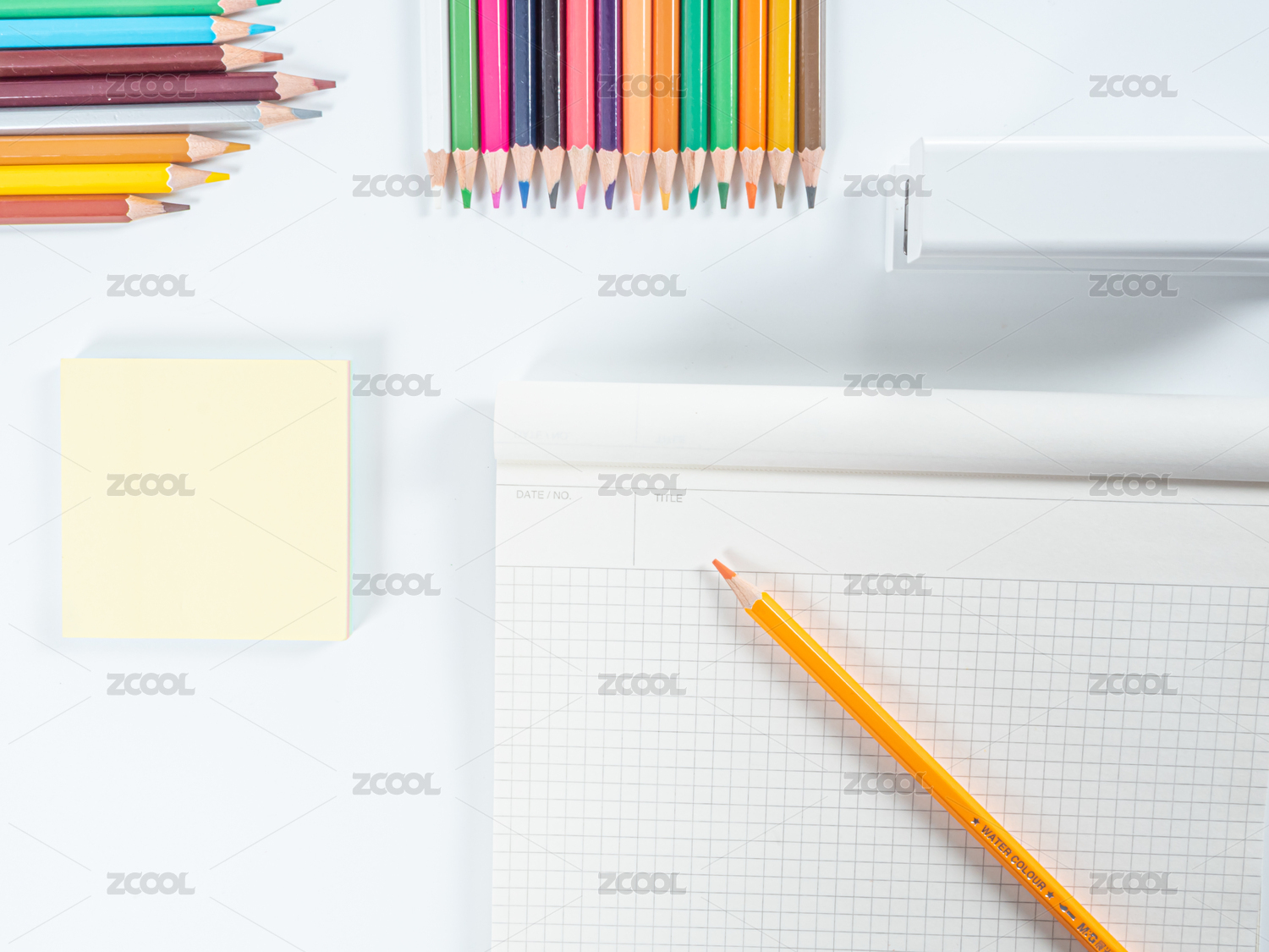 特写办公场景书桌上放着眼镜手机无线耳机以及各种办公用品