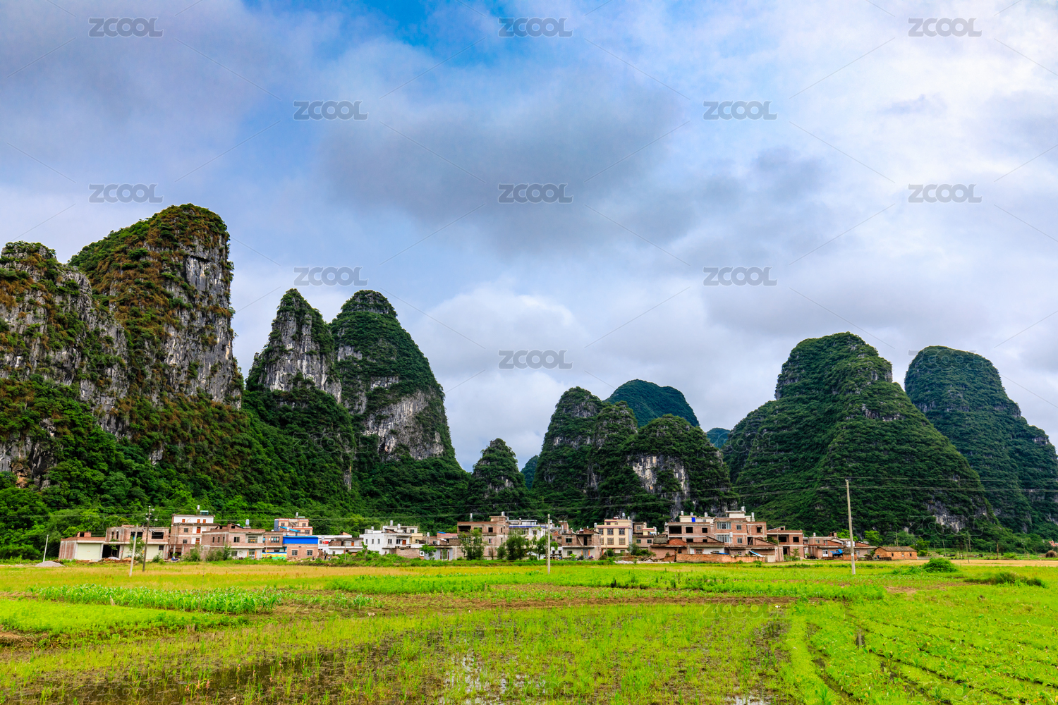 蓝天白云阳光下桂林山谷中的村庄和田地