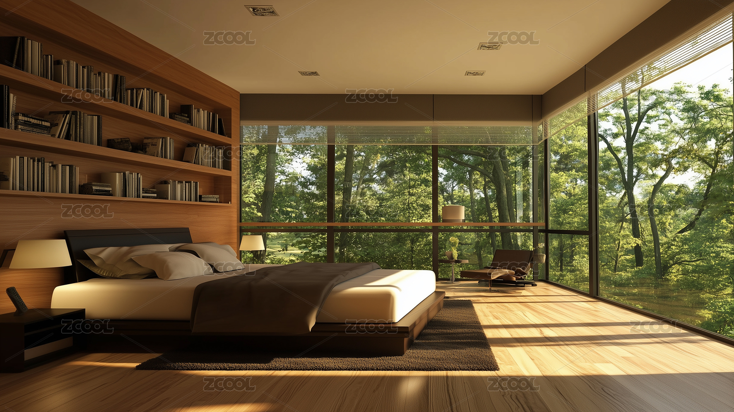 现代卧室室内设计木质墙壁和大窗户俯瞰花园