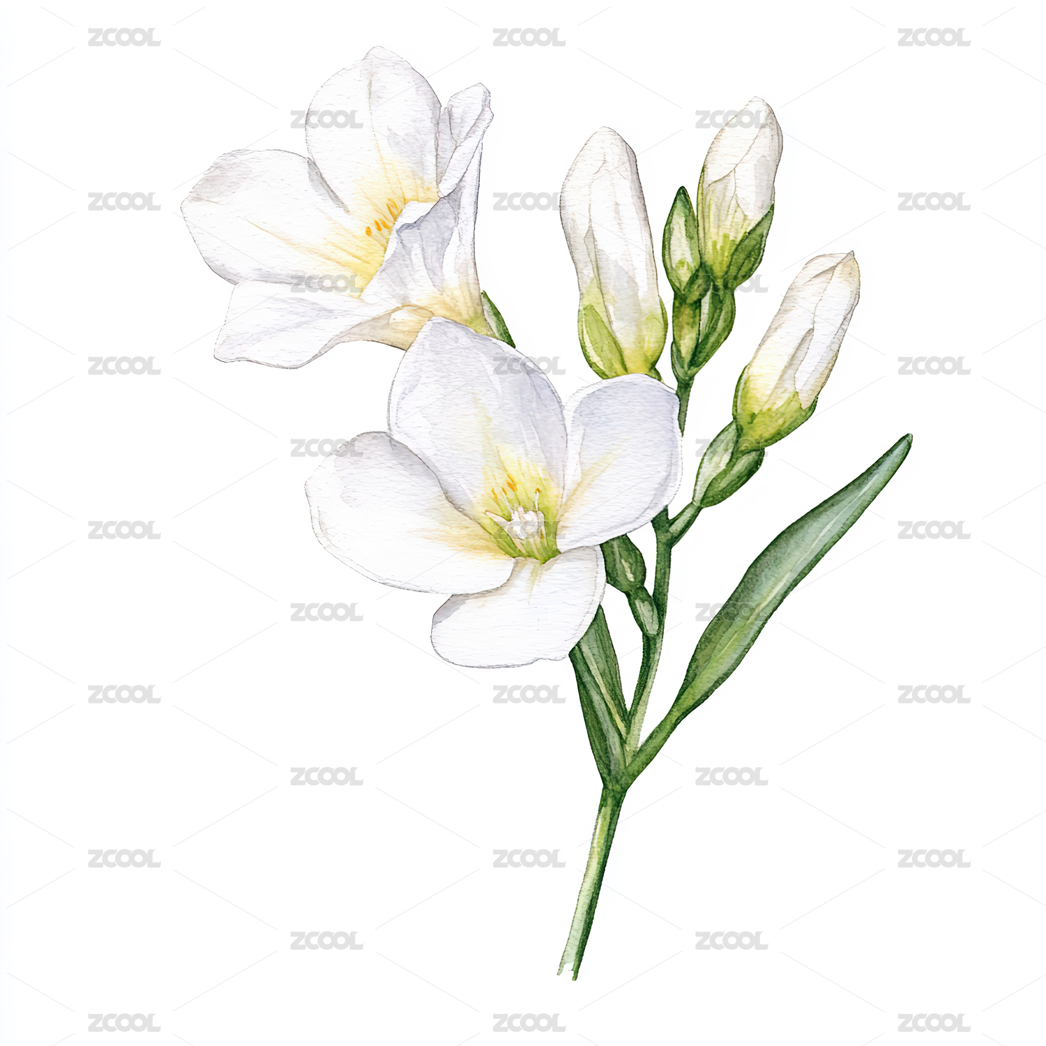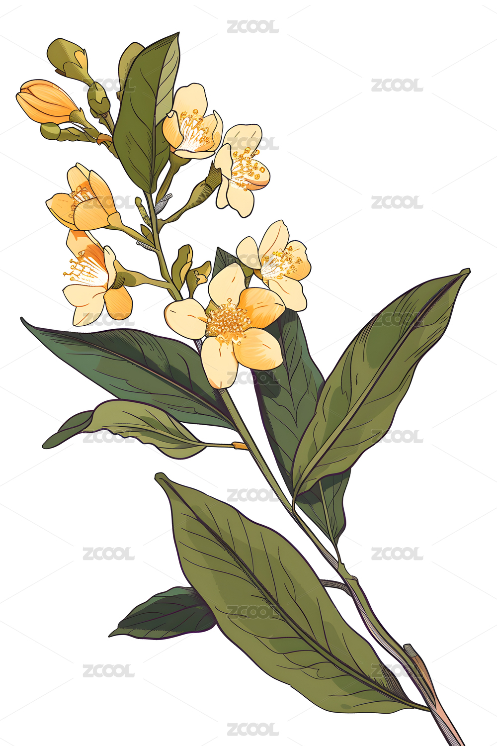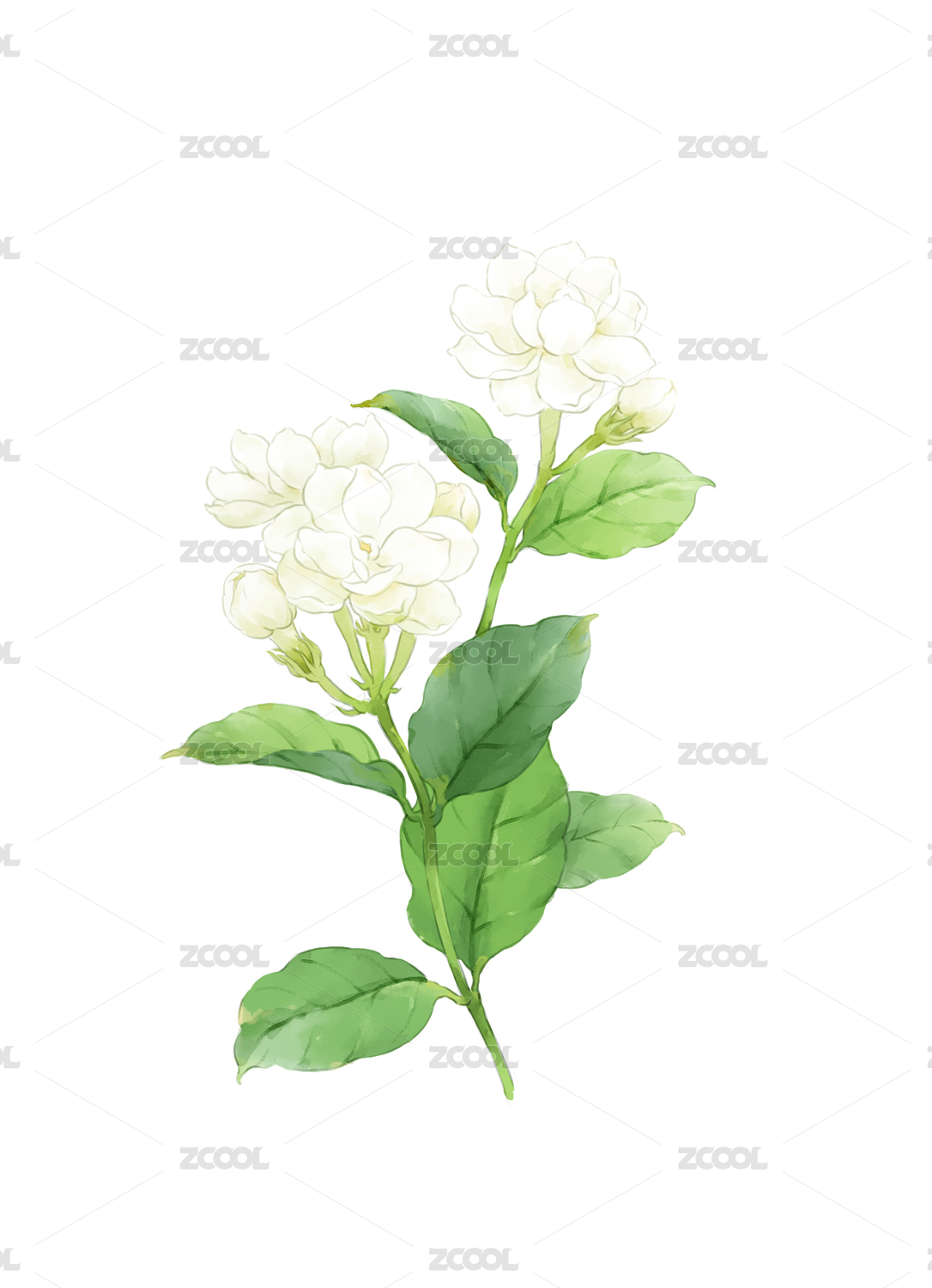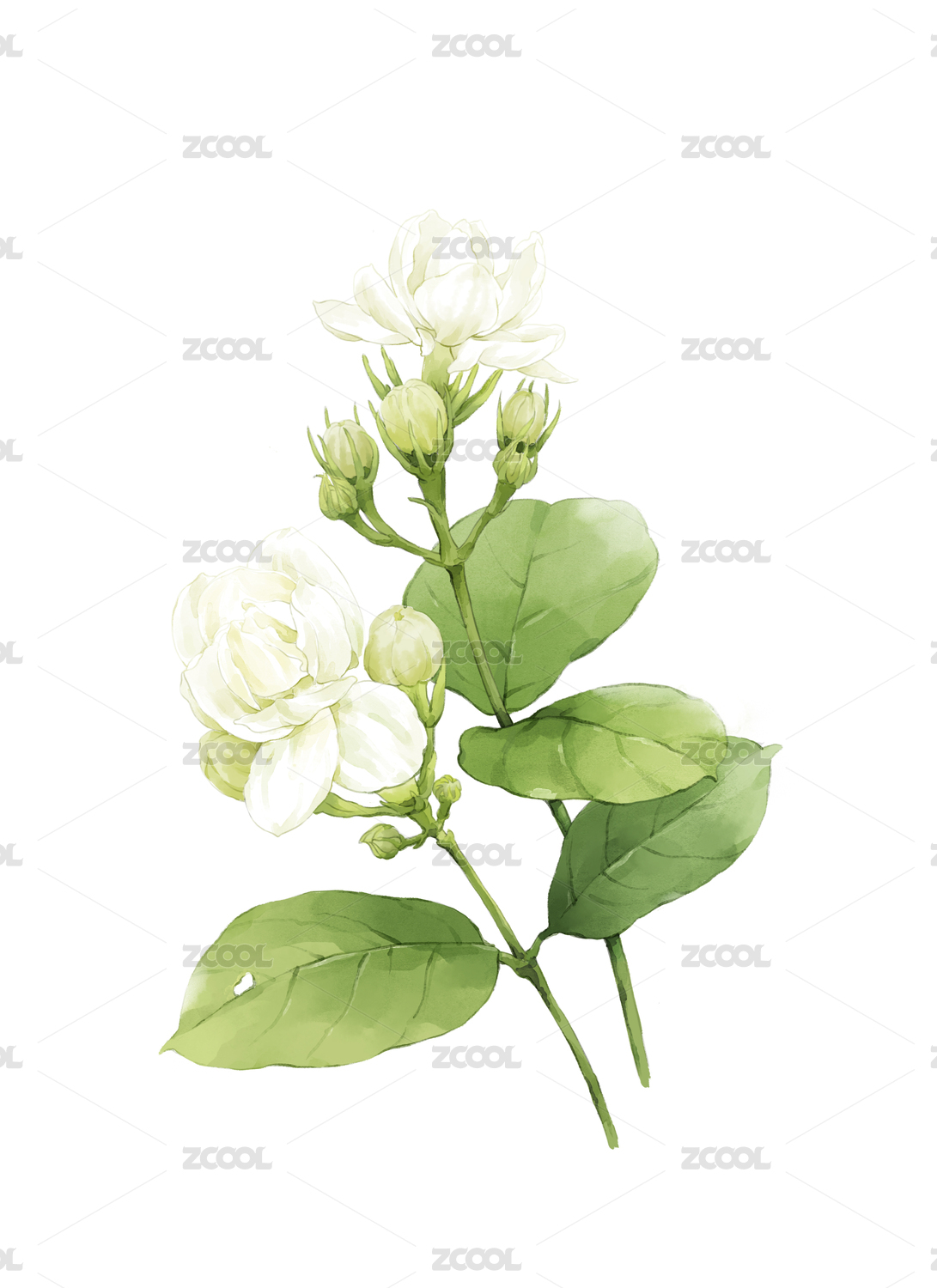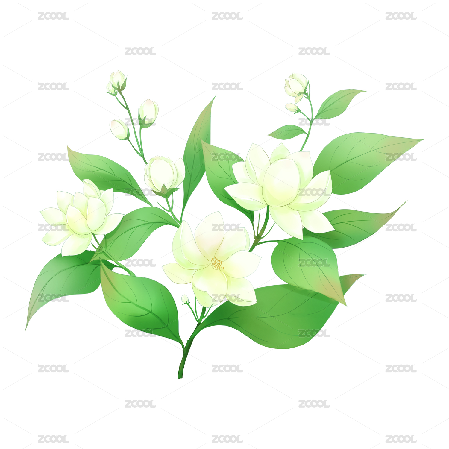 茉莉花,花朵,中式,水墨,国潮,国风,创意,花卉,叶子,绿色