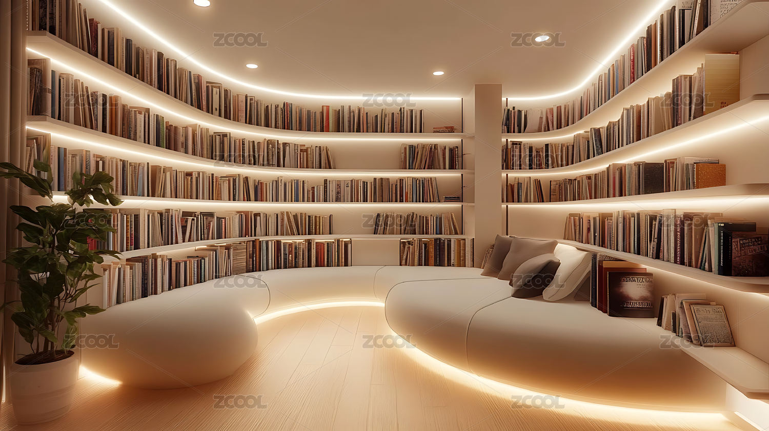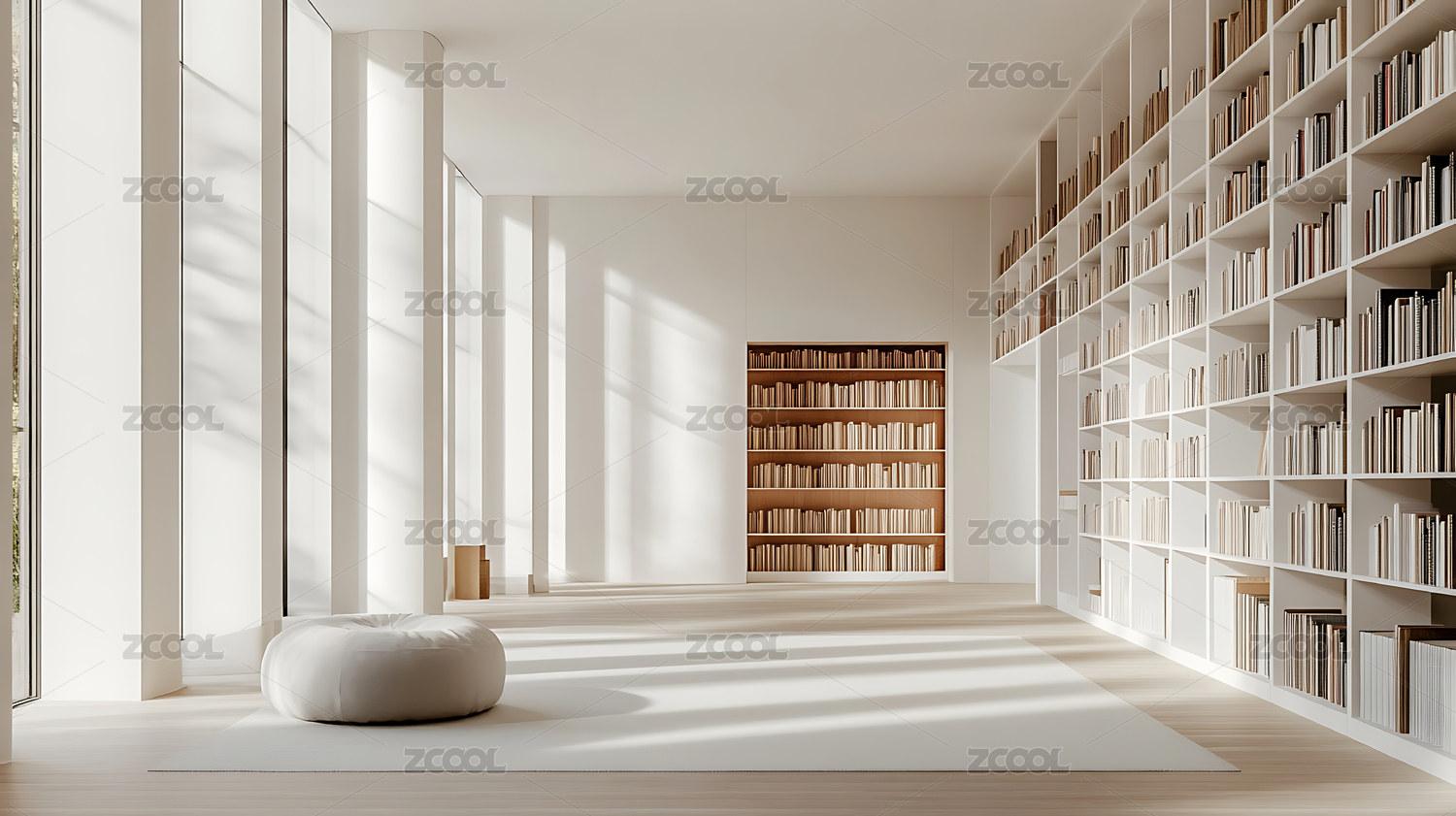 木质地板,浅色书架,几本书,花瓶与花朵,黑色圆形装饰品,灯具,单人沙发椅,简洁现代感