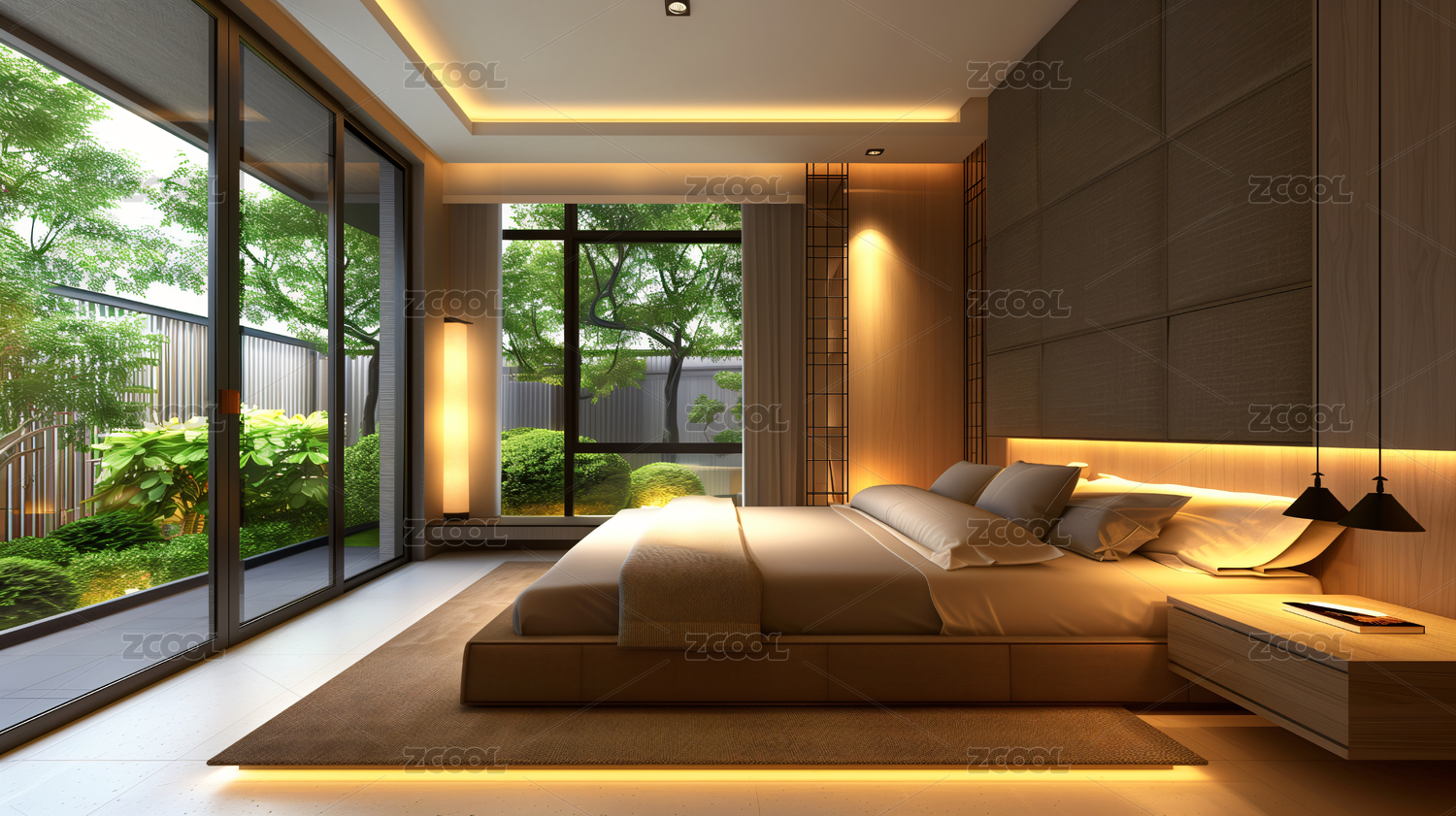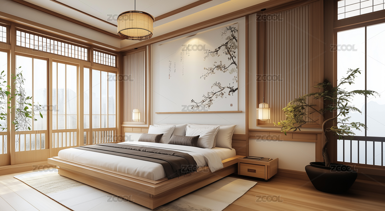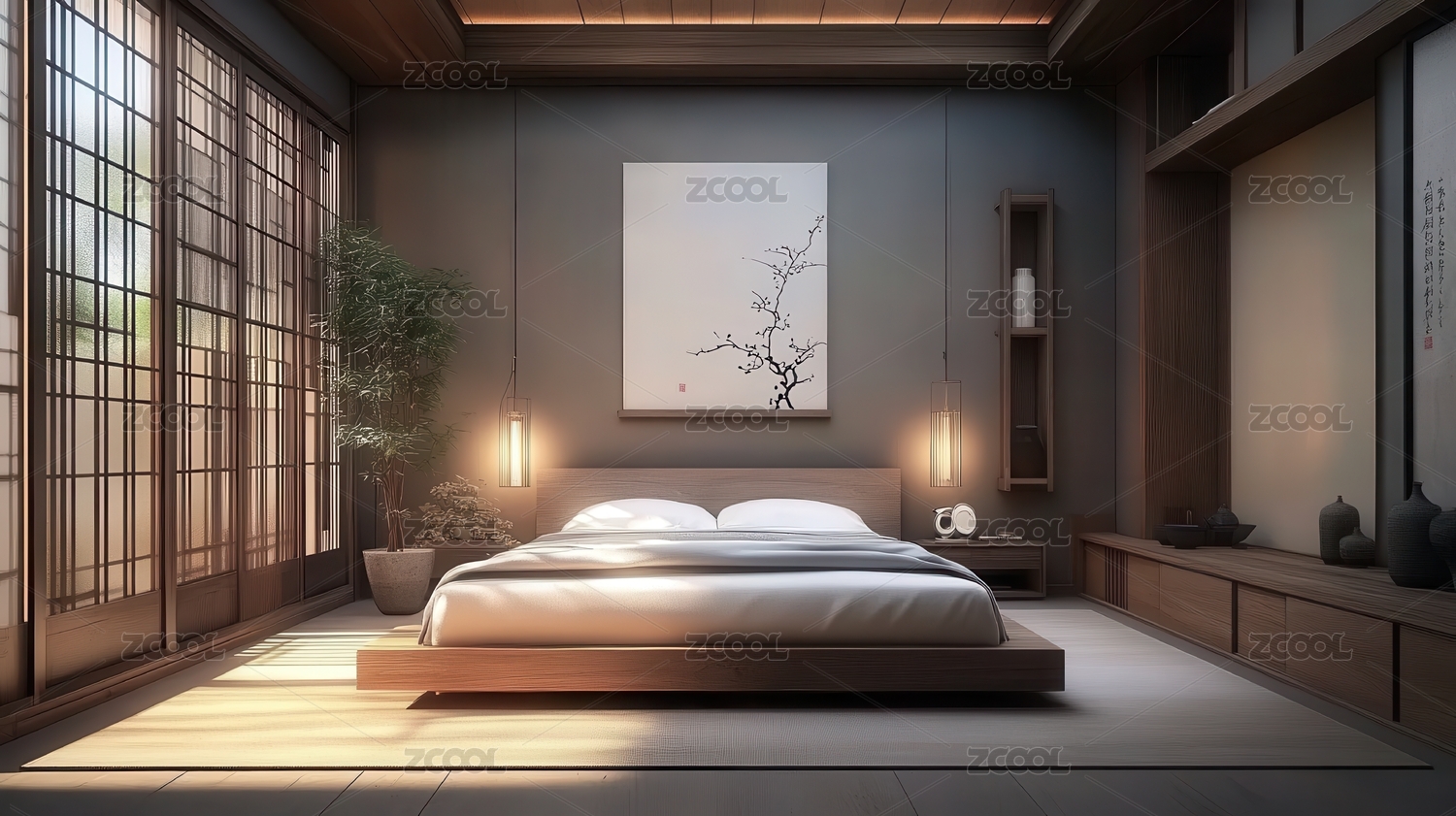 禅意,中式装修,白色卧室,原木风卧室,现代风格,室内环境白色沙发,沙发,灰色,抱枕,圆形物体