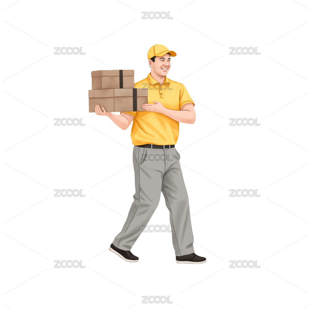 穿蓝色上衣快递员搬运快递箱行走3D元素