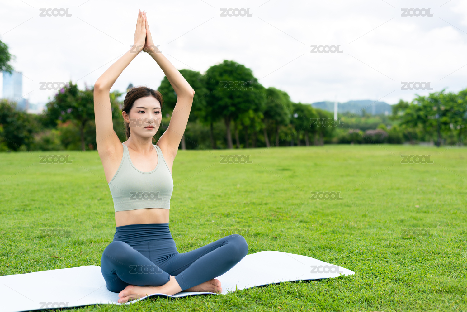 年轻女性在户外草坪上冥想