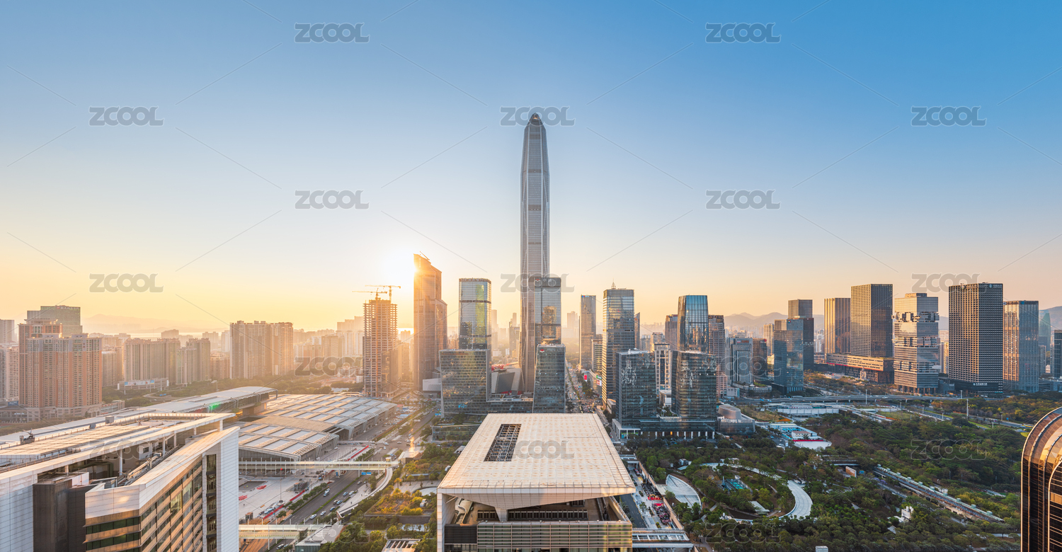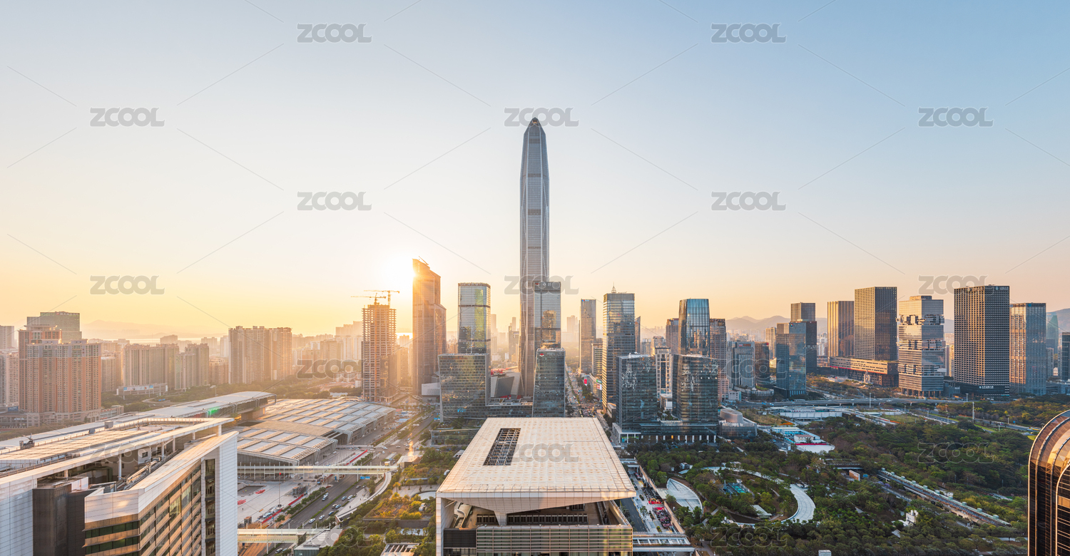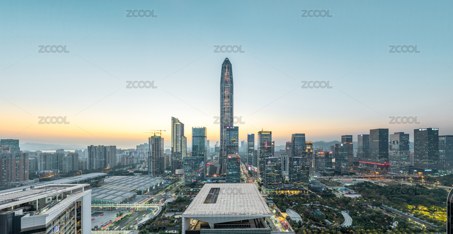 中国广东深圳福田CBD金融区城市天际线的黄昏