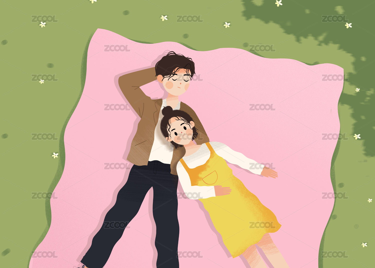 情人节一对情侣牵手约会,坐在月亮上聊天说悄悄话插画粉色纯背景
