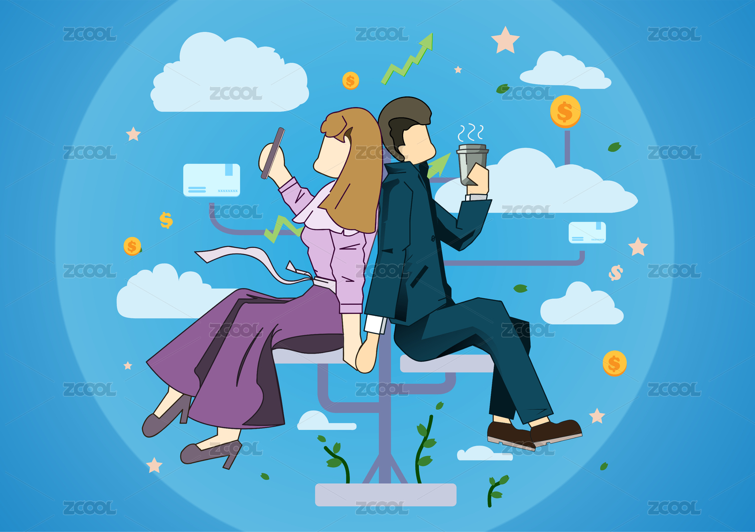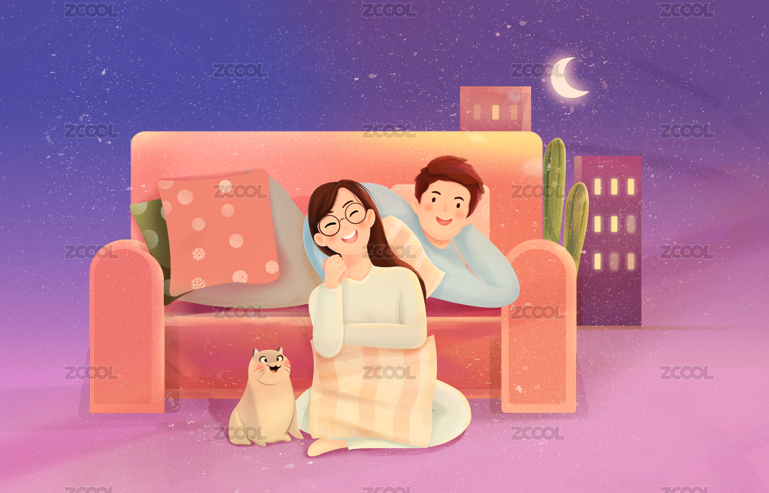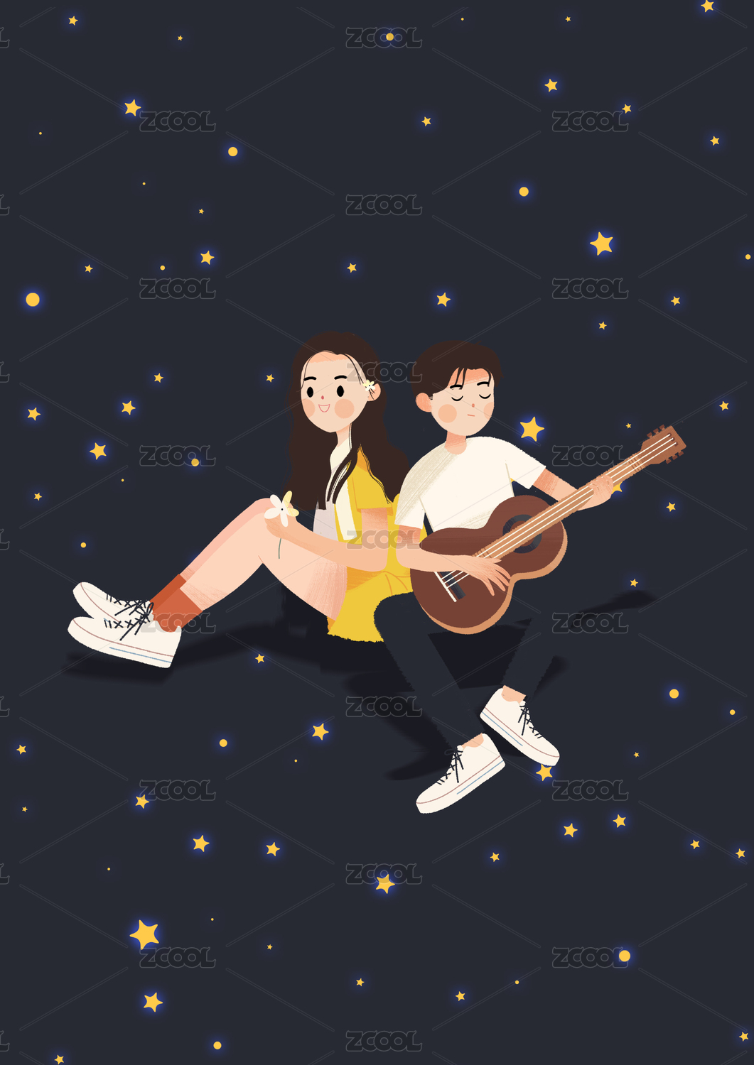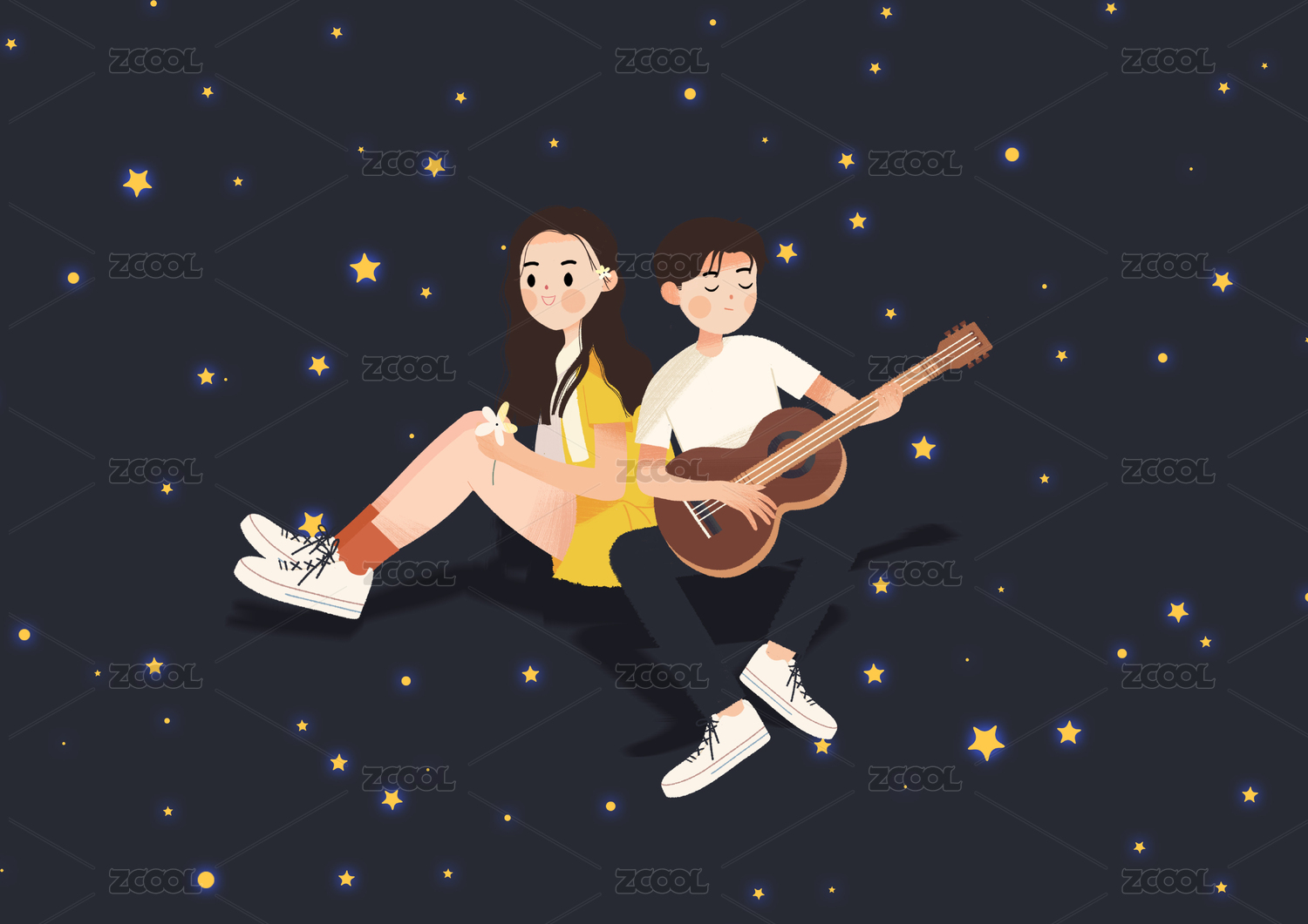 情人节的夜晚星空下一对情侣牵手约会,坐在月亮上聊天说悄悄话插画背景海报