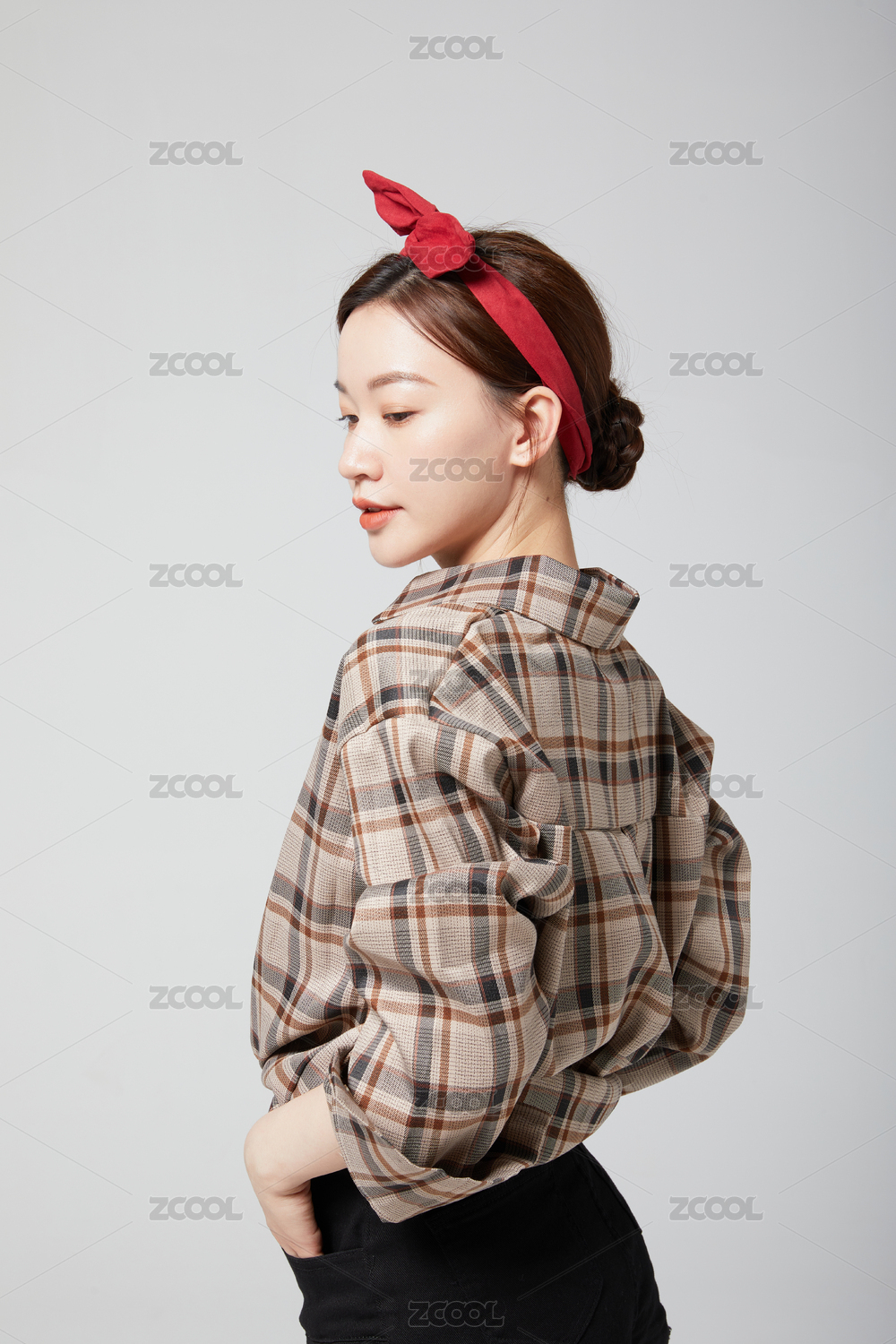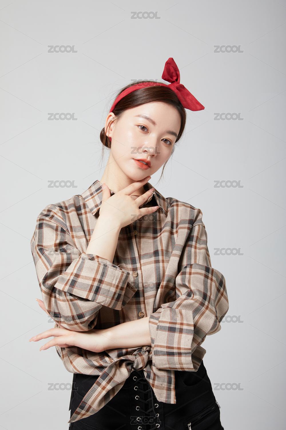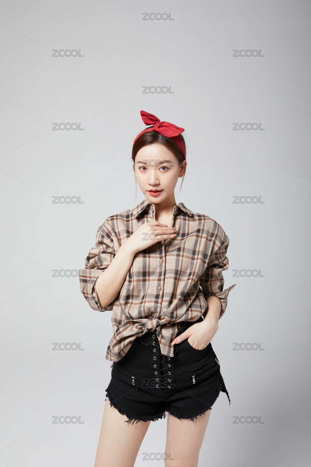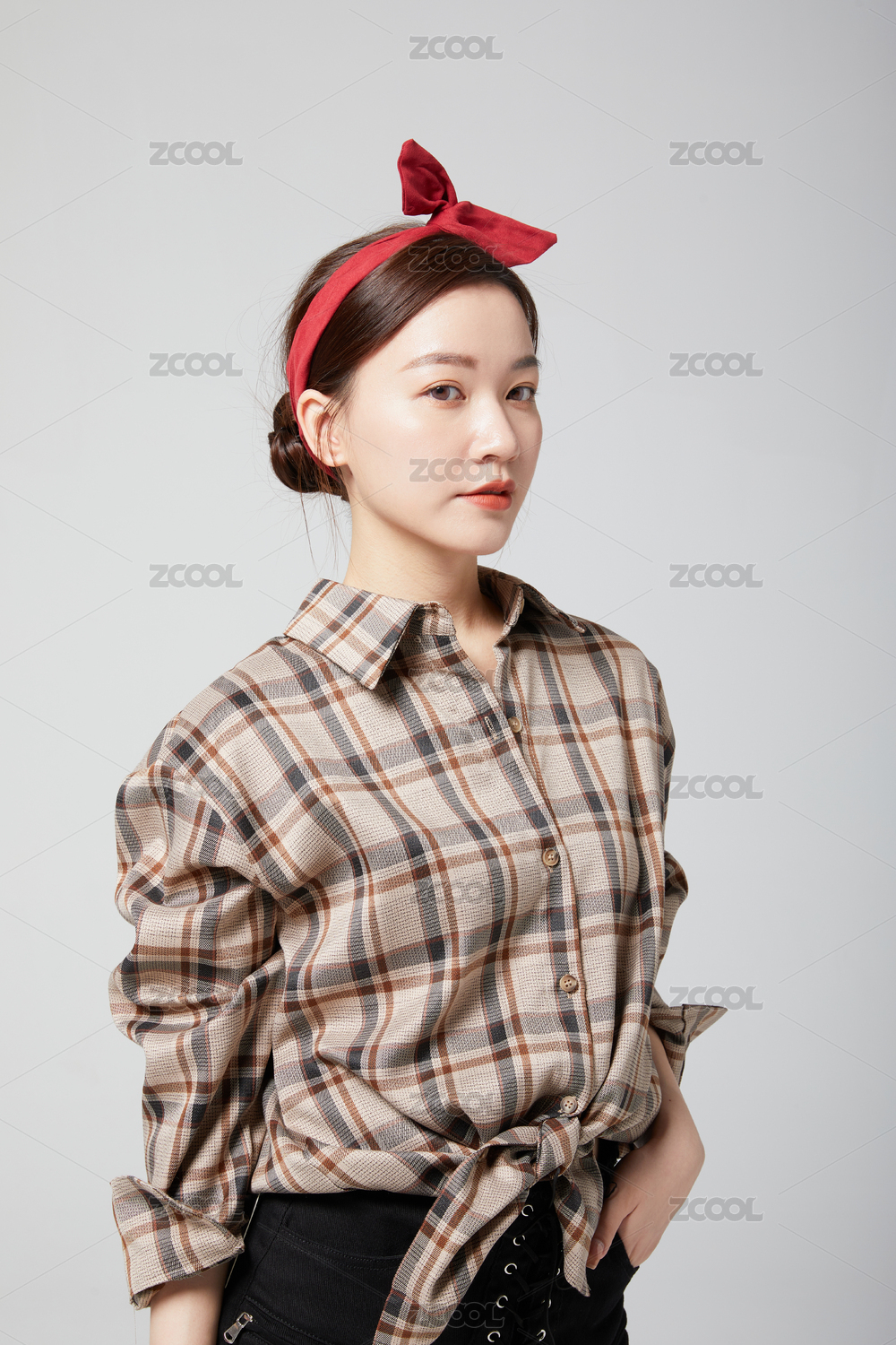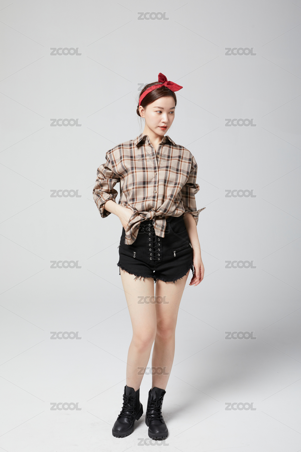 女性,青年女性,活力,半身,活力女性,格子衬衫,短裤,发带,女孩,双手抱胸
