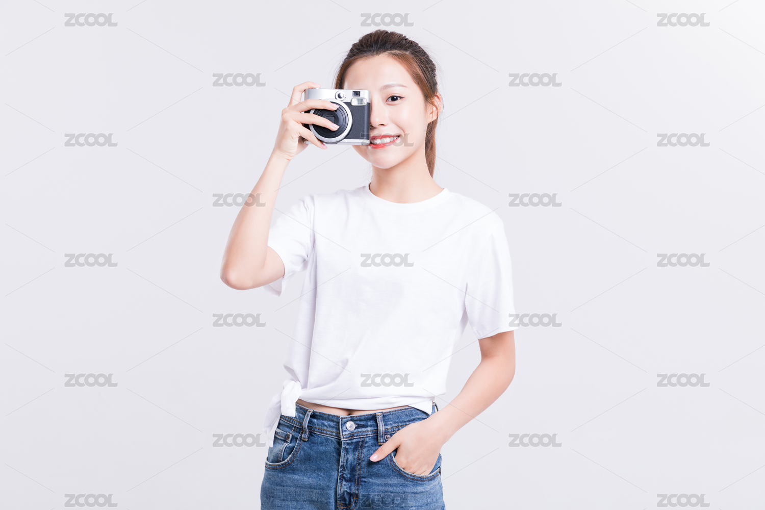 女性,大学生,白底,摄影师,拍照,笑容,摄影爱好者,相机,拿着,拿着相机