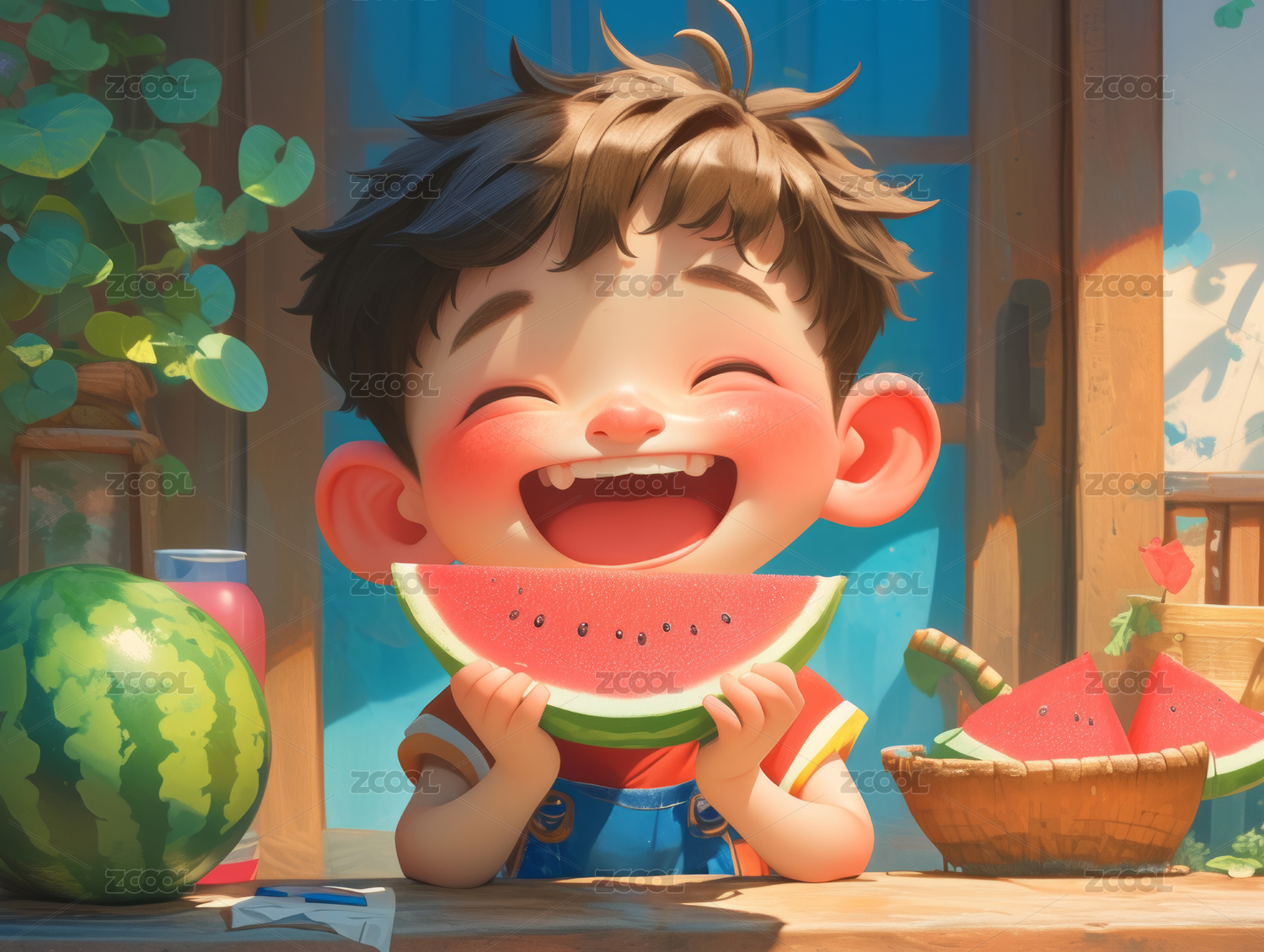 吃瓜孩童童趣风夏日场景